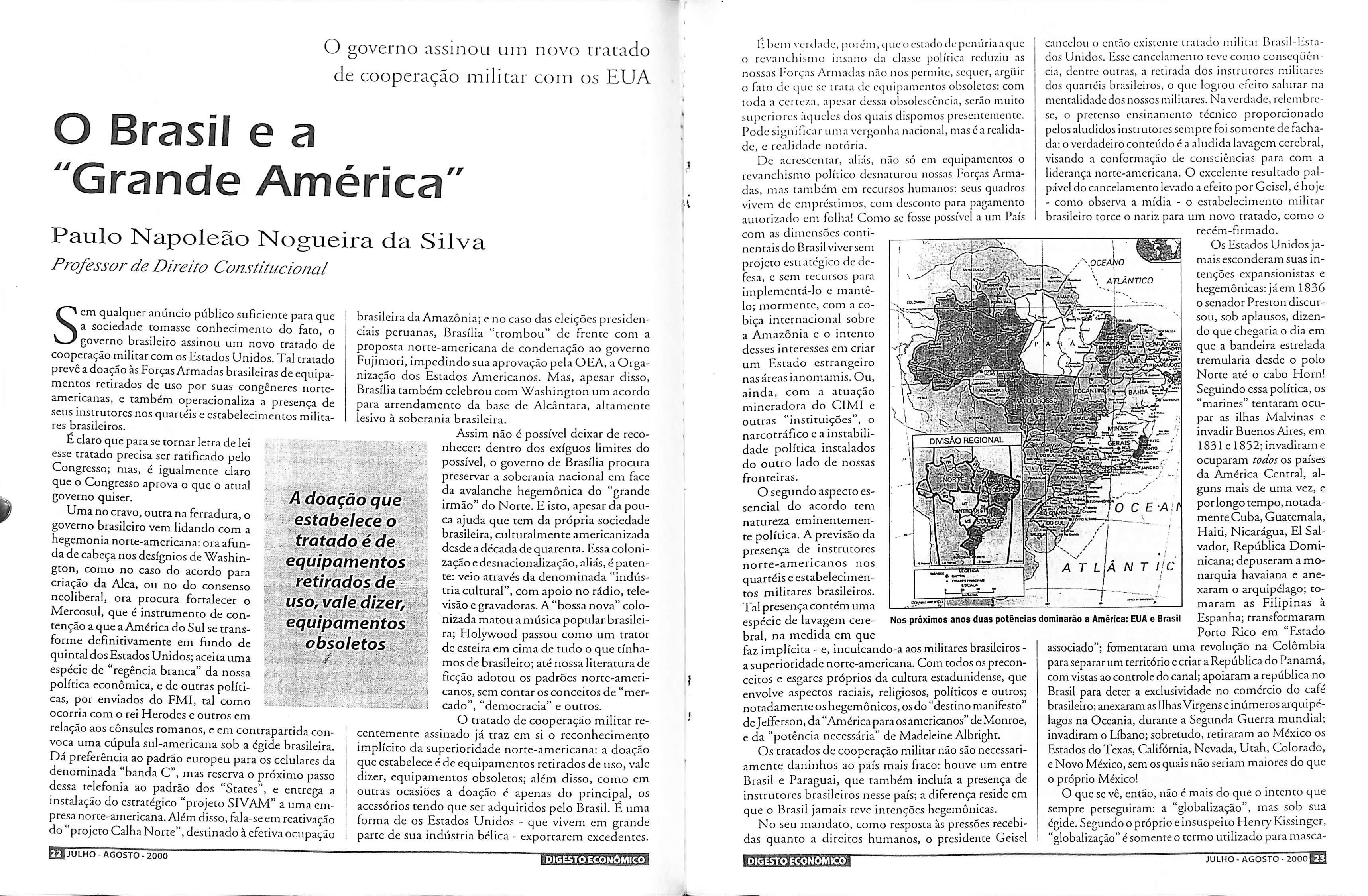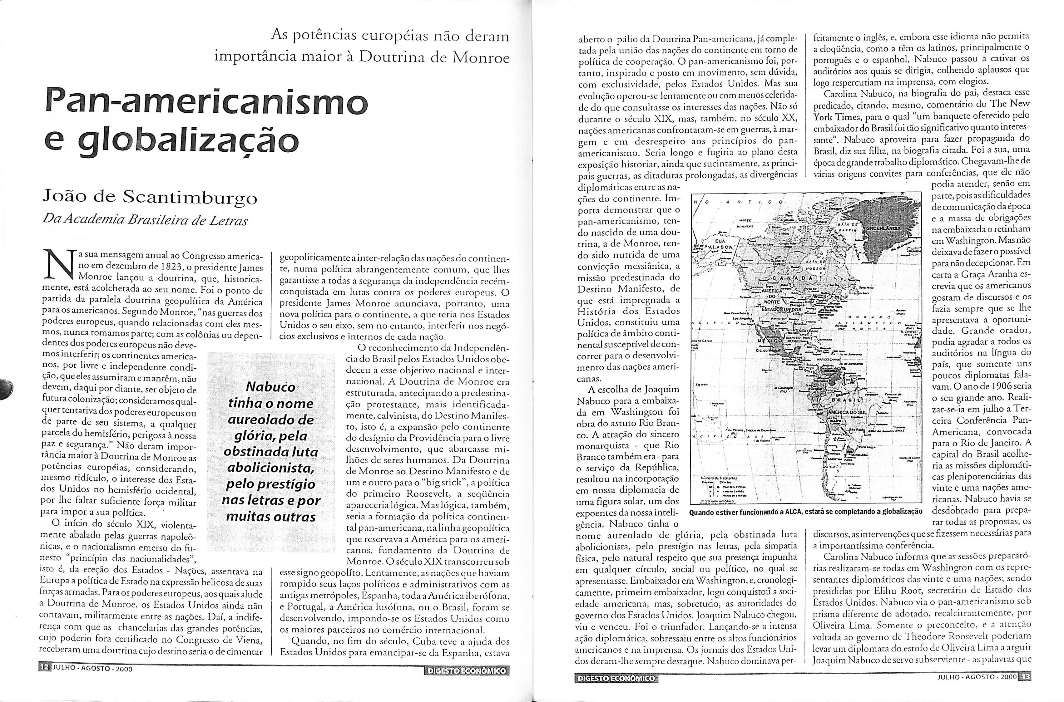tornar nente coeso, cada nação, sem sacrifício de sua soberania, identificada com o todo no grande embate pelo desenvol vimento, isto é, pela promoção dos povos à paz e à qualidade de vida digna. Apóstolo do pan-americanismo que seja considerado de seus patronos, pela altíssima compreensão de seu sentido histórico, geopolítico e econômico, cada vez mais em fase de comprovação.