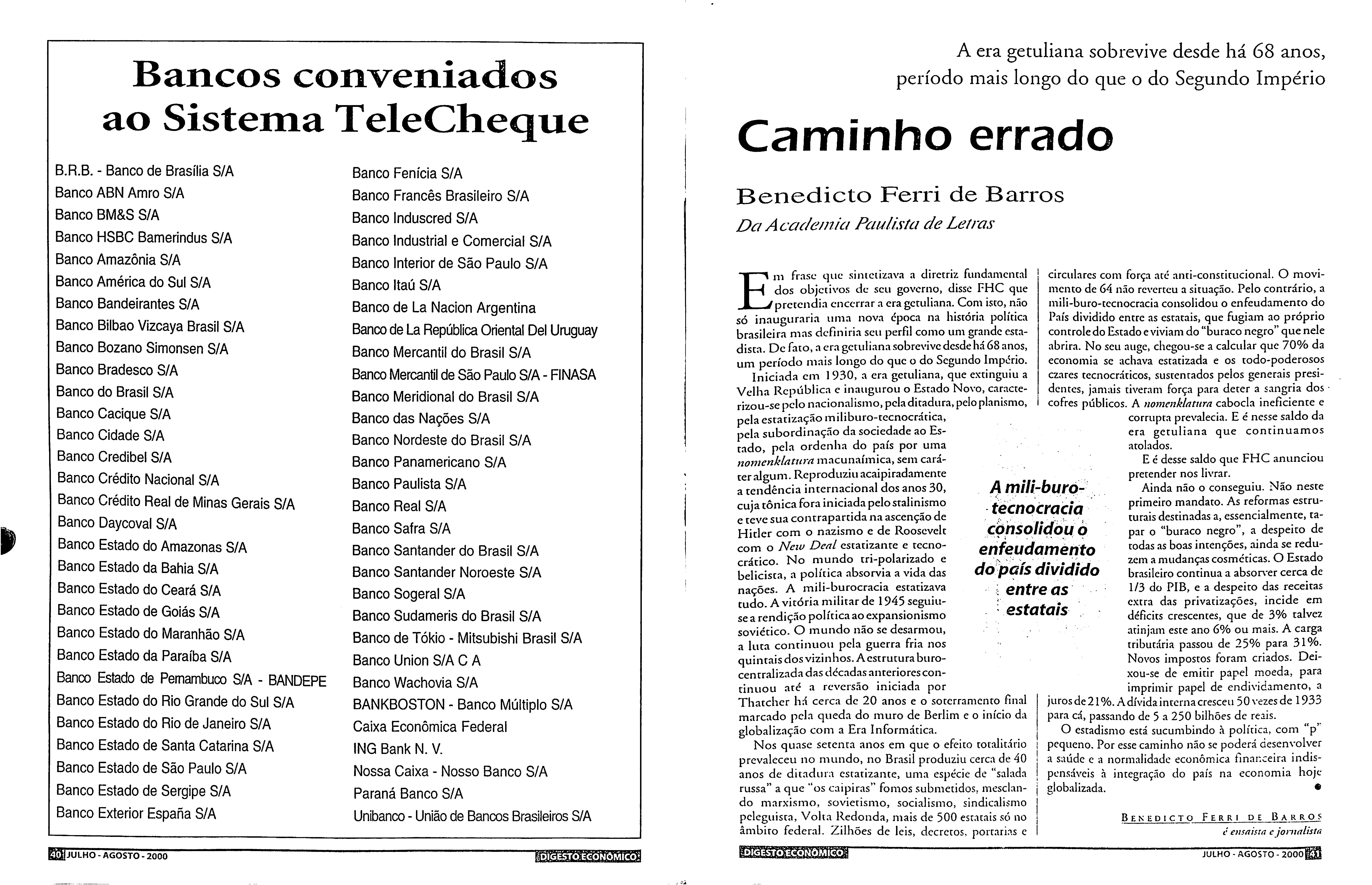 1/3 do PIB, e a despeito das receitas e.xtra das privatizações, incide em déficits crescentes, que de 3% talvez atinjam este ano 6% ou mais. A carga tributária passou de 25% para 31%Novos impostos foram criados. Dei xou-se de emitir papel moeda, para imprimir papel de endividamento, a juros de 21%. A dívida interna cresceu 50vezesde l93o para cá, passando de 5 a 250 bilhões de reais. O estadismo está sucumbindo à política, com “p pequeno. Por esse caminho não se poderá desenvolver a saúde e a normalidade econômica financeira indis pensáveis à integração do país na economia hoje globalizada.