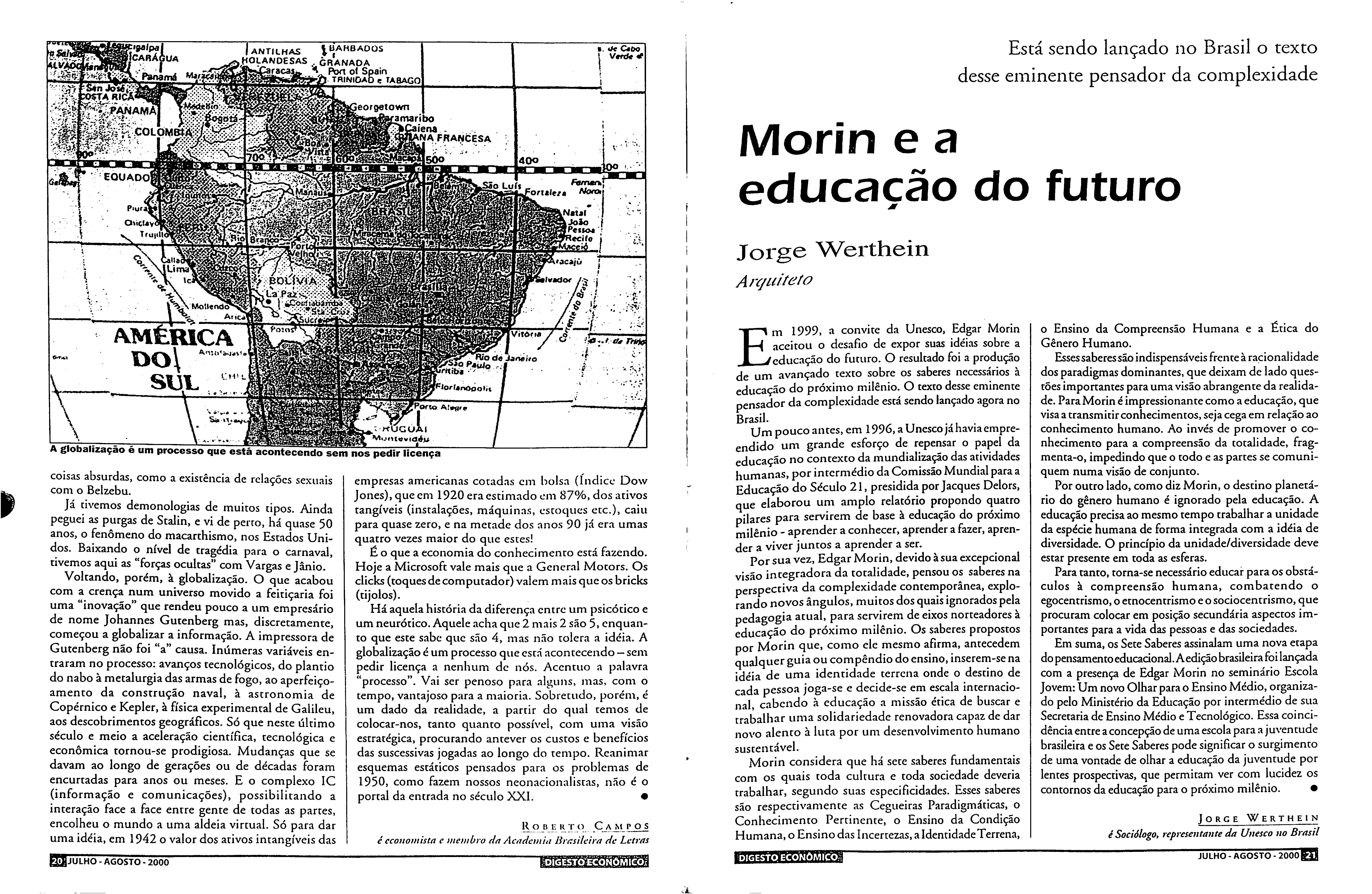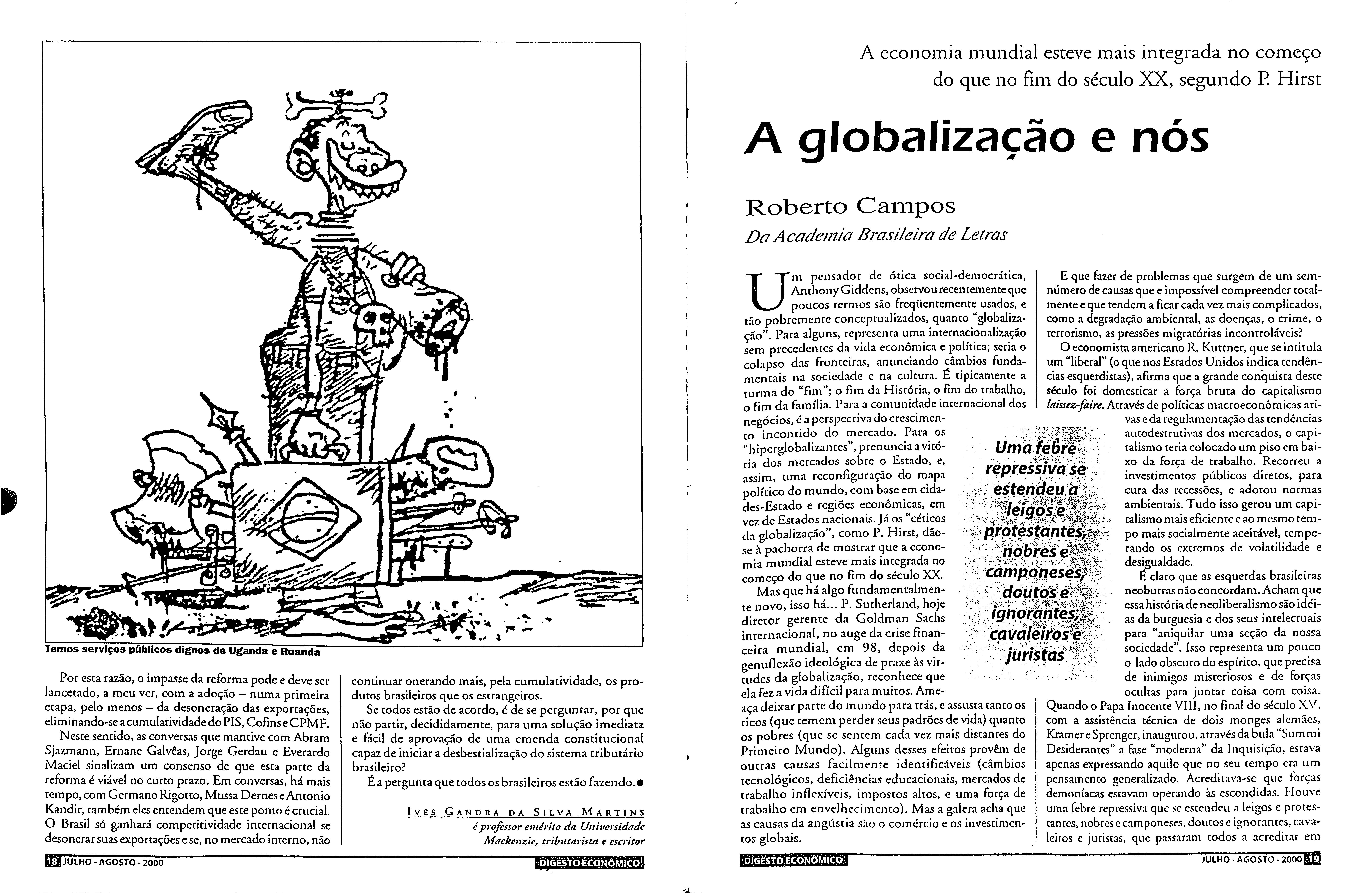 Já tivemos demonologias de muitos tipos. Ainda peguei as purgas de Stalin, e vi de perto, há quase 50 anos, o fenômeno do macarthismo, nos Estados Uni dos. Baixando o nível de tragédia para o carnaval, tivemos aqui as “forças ocultas” com Vargas e Jânio. Voltando, porém, à globalização. O que acabou com a crença num universo movido a feitiçaria foi “inovação” que rendeu pouco a um empresário de nome Johannes Gutenberg mas, discretamente, começou a globalizar a informação. A impressora de Gutenberg não foi “a” causa. Inúmeras variáveis en traram no processo: avanços tecnológicos, do plantio do nabo à metalurgia das armas de fogo, ao aperfeiço amento da construção naval, à astronomia de Copérnico e Kepler, à física experimental de Galileu, aos descobrimentos geográficos. Só que neste último século e meio a aceleração científica, tecnológica e econômica tornou-se prodigiosa. Mudanças que davam ao longo de gerações ou de décadas foram encurtadas para anos ou meses. E o complexo IC (informação e comunicações), possibilitando a interação face a face entre gente de todas as partes, encolheu o mundo a uma aldeia virtual. Só para dar uma idéia, em 1942 o valor dos ativos intangíveis das HíHjULHO - AGOSTO - 2000