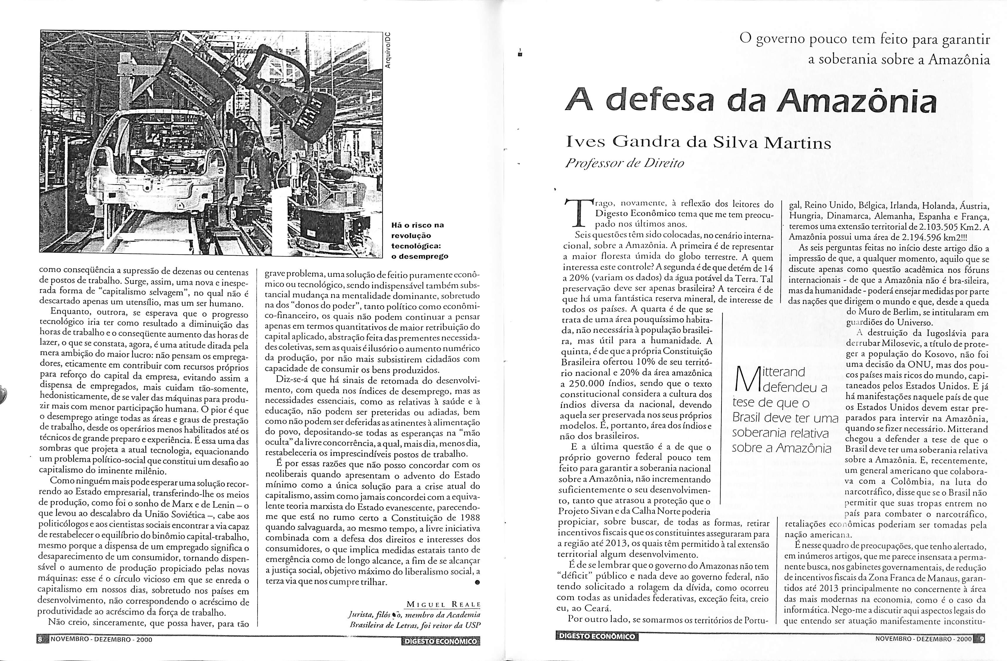 representar quem interessa este controle? A segunda é de que detém de 14 a 20% (variam os dados) da água potável da Terra. Tal preservação deve ser apenas brasileira? A terceira é de que há uma fantástica reser\'a mineral, de interesse de todos os países. A quarta é de que se trata de uma área pouquíssimo habita da, não necessária à população brasilei ra, mas útil para a humanidade. A quinta, é de que a própria Constituição Brasileira ofertou 10% de seu territóítterand defendeu a rio nacional e 20% da área amazônica a 250.000 índios, sendo que o texto constitucional considera a cultura dos índios diversa da nacional, devendo aquela ser preservada nos seus próprios modelos. È, portanto, área dos índios c não dos brasileiros.
