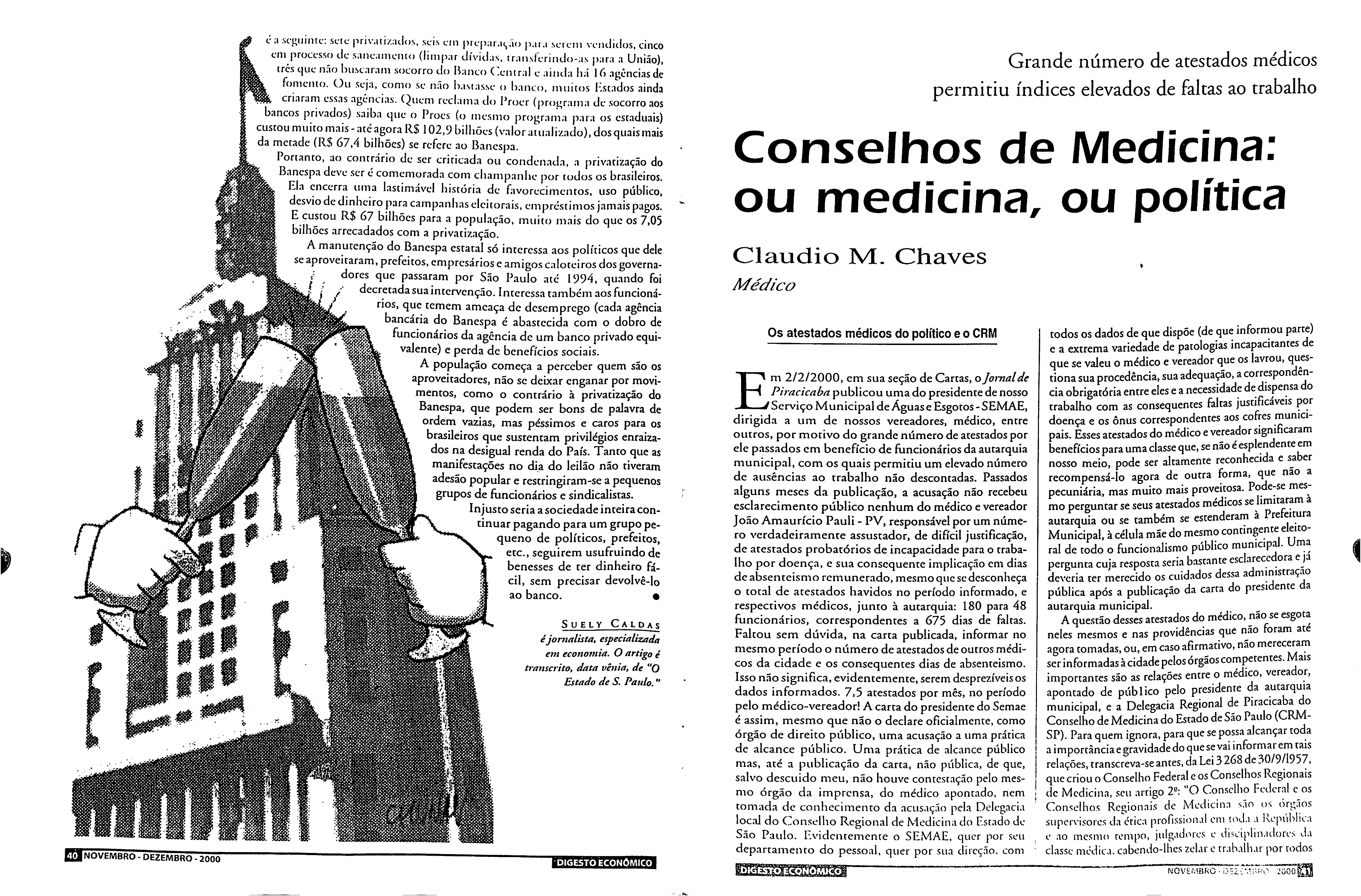 m 2/2/2000, em sua seção de Cartas, o Jomalde Piracicaba publicou uma do presidente de nosso J Serviço M unicipal de Águas e Esgotos - SEMAE, dirigida a um de nossos vereadores, médico, entre outros, por motivo do grande número de atestados por ele passados em benefício de funcionários da autarquia municipal, com os quais permitiu um elevado número de au.sências ao trabalho não descontadas. Passados alguns meses da publicação, a acusação não recebeu esclarecimento público nenhum do médico e vereador João Amaurício Pauli - PV, responsável por um núme ro verdadeiramente assustador, de difícil justificação, de atestados probatórios de incapacidade para o traba lho por doença, e sua consequente implicação em dias de absenteismo remunerado, mesmo que sc desconheça o total de atestados havidos no período informado, e respectivos médicos, junto à autarquia: 180 para 48 funcionários, correspondentes a 675 dias de faltas. Faltou sem dúvida, na carta publicada, informar no mesmo período o número de atestados de outros médi cos da cidade e os consequentes dias de absenteismo. Isso não significa, evidentemente, serem desprezíveisos dados informados. 7,5 atestados por mês, no período pelo médico-vereador! A carta do presidente do Semae é assim, mesmo que não o declare oficialmente, como órgão de direito público, uma acusação a uma prática de alcance público. Uma prática de alcance público mas, até a publicação da carta, não pública, de que, salvo descuido meu, não houve contestação pelo mes mo órgão da imprensa, do médico apontado, nem tomada de conhecimento da acusação pela Delegacia local do Con.selho Regional de Medicinado Estado de São Paulo. Evádentemente o SEMAE, quer por seu departamento do pessoal, quer por sua direção, com
