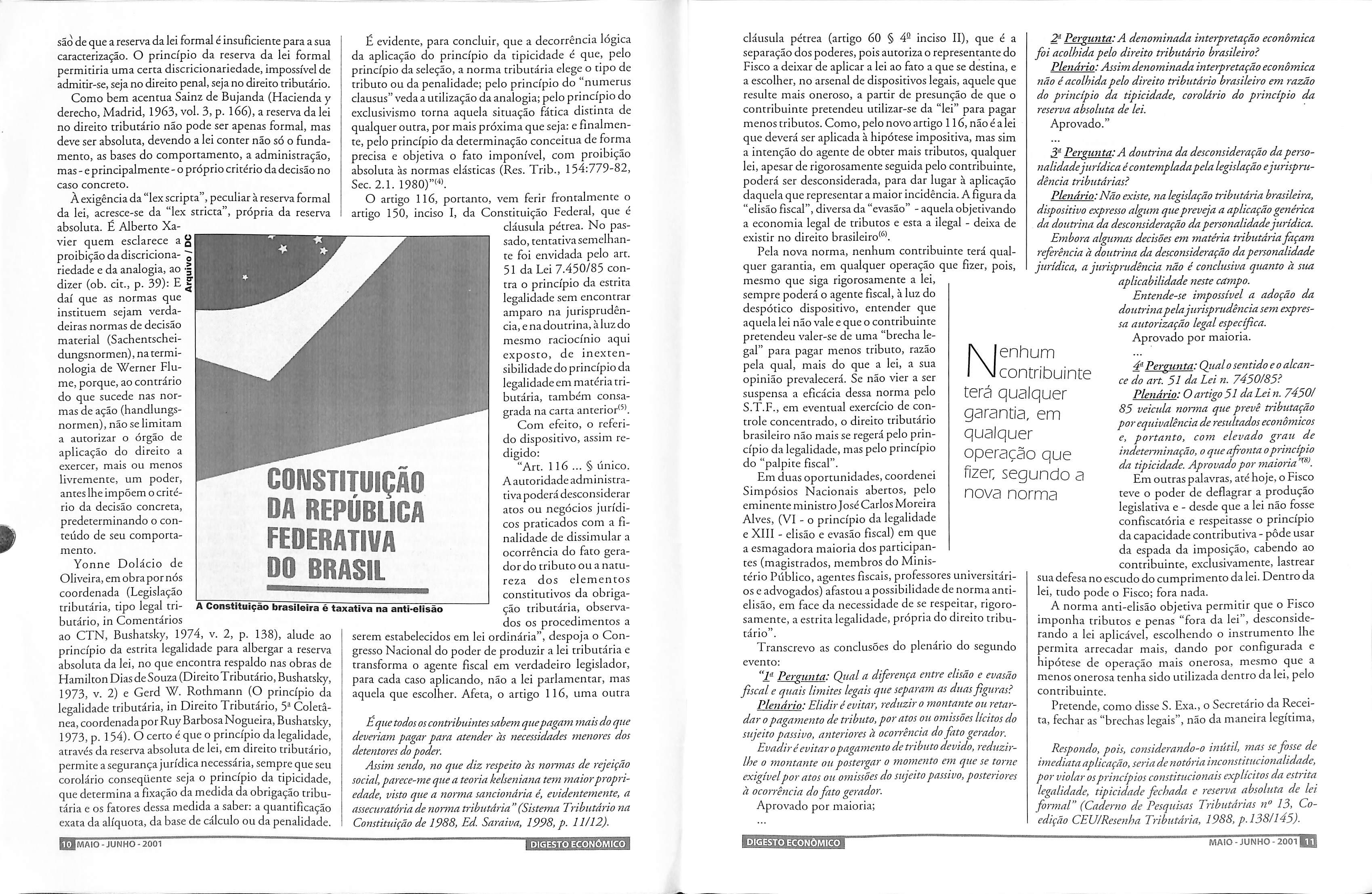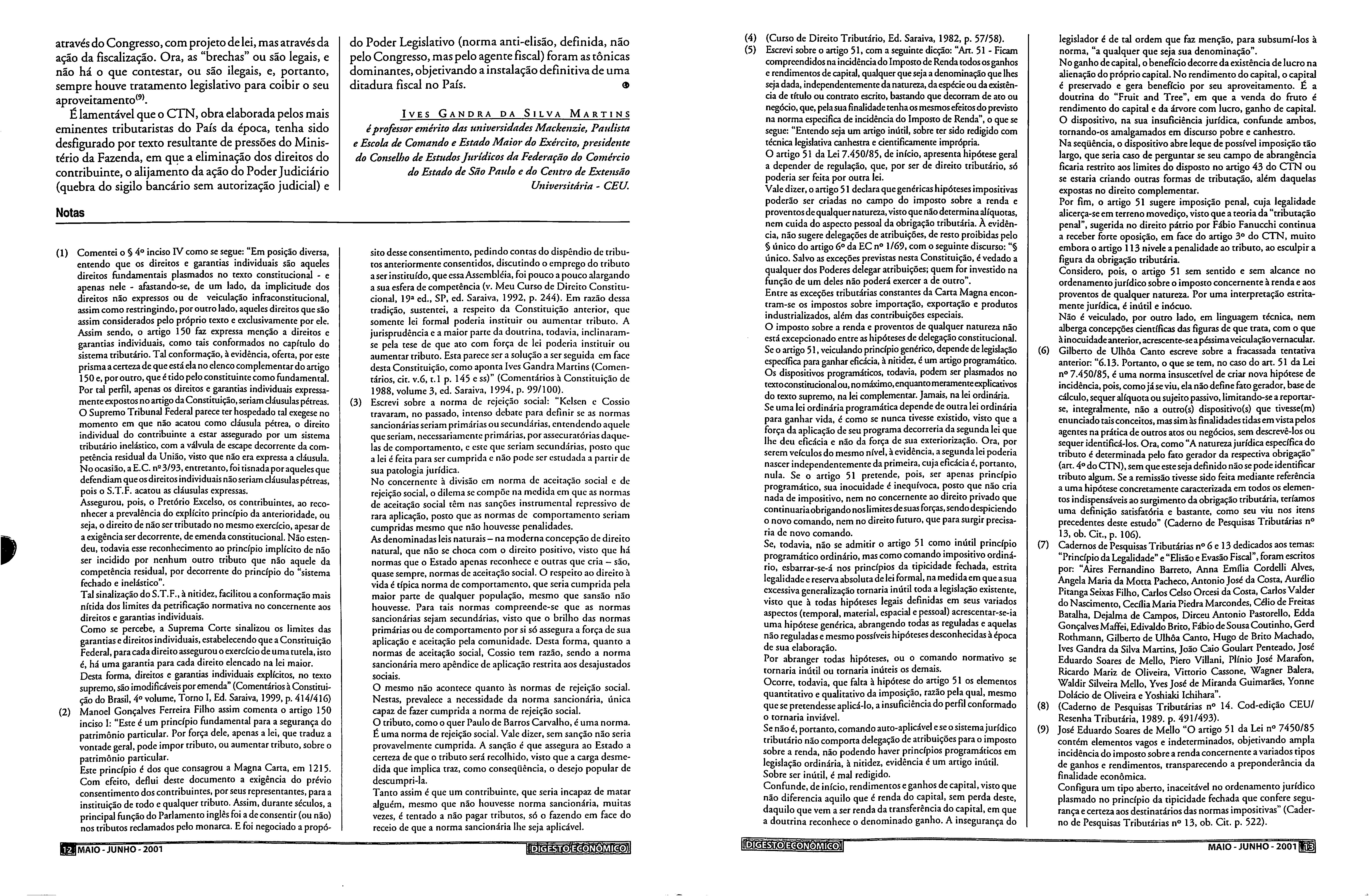 (7) Cadernos de Pesquisas Tributárias n° 6 e 13 dedicados aos temas: “Princípio da Legalidade” e “Elisão e Evasão Fiscal”, foram escritos por: “Aires Fernandino Barreto, Anna Emília Cordelli Alves, Angela Maria da Motta Pacheco, Antonio José da Costa, Aurélio Pitanga Seixas Filho, Carlos Celso Orcesi da Costa, Carlos Valder do Nascimento, Cecília Maria Piedra Marcondes, Célio de Freitas Batalha, Dejalma de Campos, Dirceu Antonio Pastorello, Edda Gonçalves Maffei, Edivaldo Brito, Fábio de Sousa Coutinho, Gerd Rothmann, Gilberto de Ulhôa Canto, Hugo de Brito Machado, Ives Gandra da Silva Martins, João Caio Goulart Penteado, Jose Eduardo Soares de Mello, Piero Villani, Plínio José Marafon, Ricardo Mariz de Oliveira, Vittorio Cassone, Wagner Balera, Waldir Silveira Mello, Yves José de Miranda Guimarães, Yonne Dolácio de Oliveira e Yoshiíüd Ichihara”.