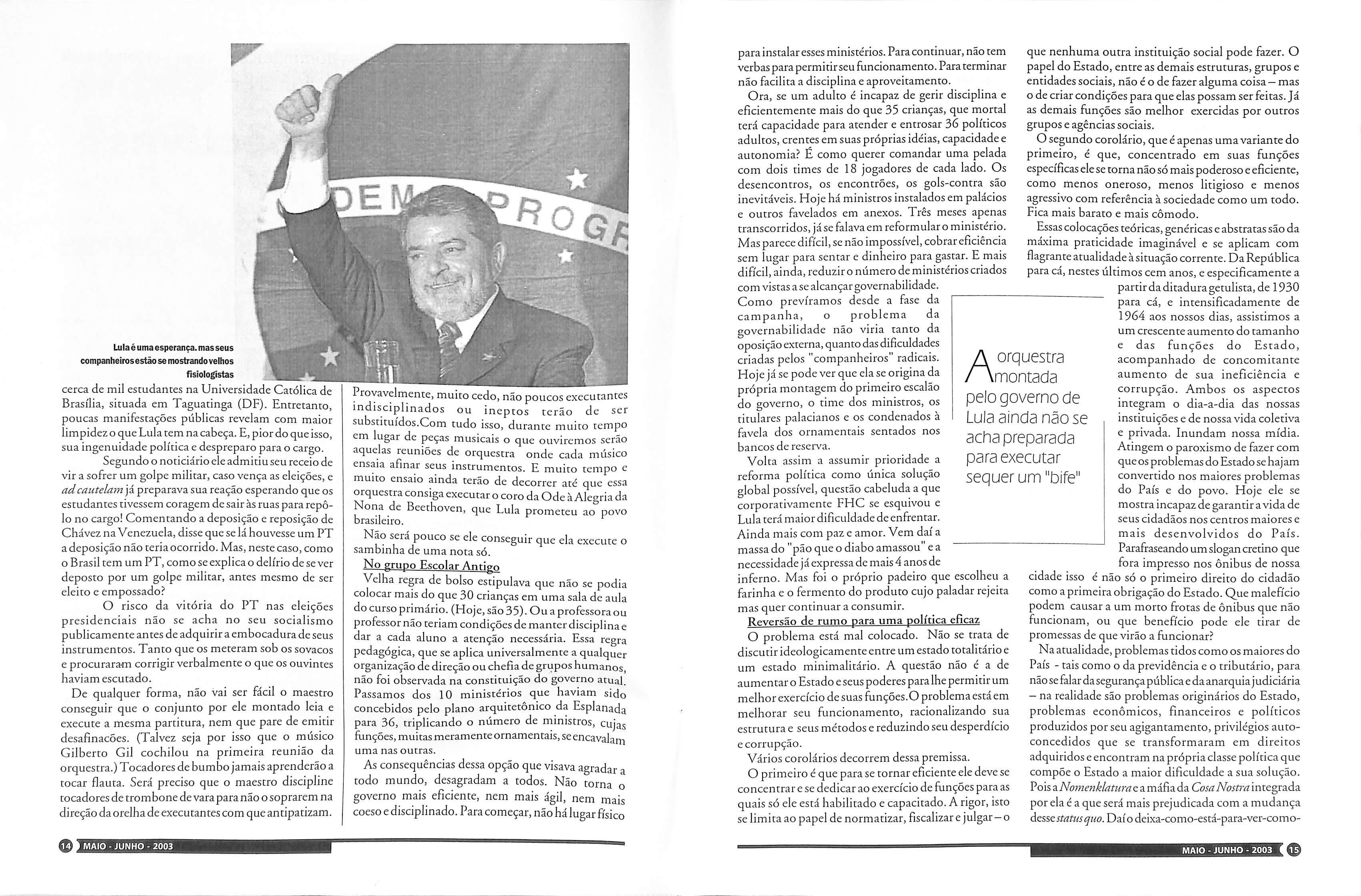 Actóides dessa natureza são análogos no seu primarismo e petulância, aos de Jânio, outro messiânico (embora desonestojque se preocupava com fechar rinhas de galos, aplicar pessoalmente multas de trânsito e determinar o tamanho dos biquínis. Há idêntica tonalidade na ênfase que se vem imprimindo ao programa “fome zero” e sua programada “tournée” ministerial.