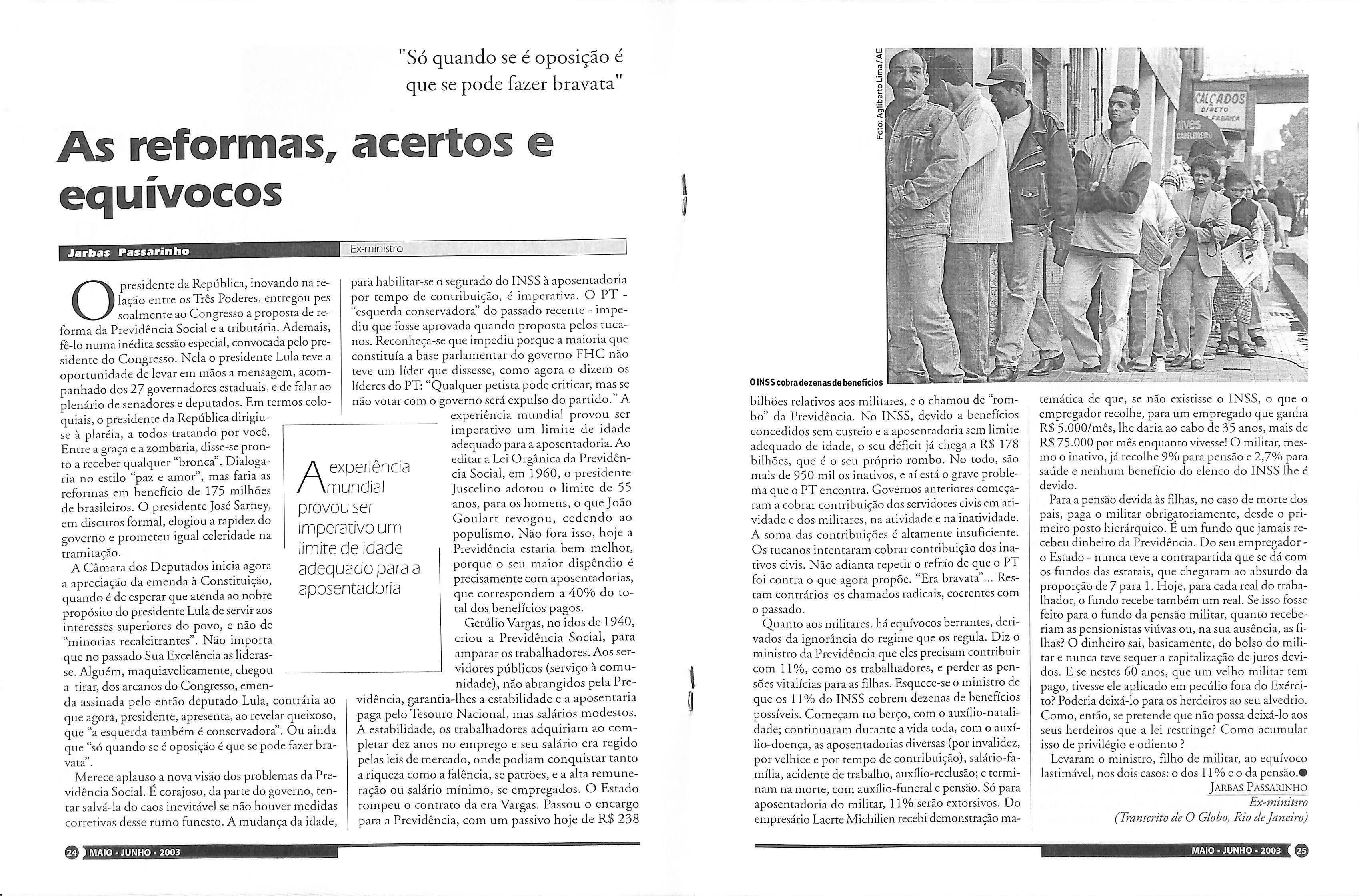 Está certo, portanto, o ministro Ricardo Berzoini na sua insistência. Mas como chegar ao ponto de des tino? Primeiro, conhecendo melhor a realidade previdenciária, que é muito mal divulgada aos brasi leiros. Depois, começando a propor regras simples, de entendimento geral, que percorram o intelecto coletivo. Por exemplo: a noção de uma conta indivi dual previdenciária, consistente de um cartão e de um número identificador de cada contri— buinte. O conceito está longe de ser uma novidade - aliás, já existe um nú mero de PIS para cada um -, mas não é ainda um sistema organizado para valorizar e respeitar a contribuição de cada um para sua própria futura apo sentadoria. A idéia da integração do sistema parte dessa identificação uni versal, e não da suposta nivelação de situações desiguais. Pelo contrário: é a identificação que permitirá 1) a visualização de direitos, adquiridos ou em via de aquisição 2) a maior regu laridade dos pagamentos ou recebi mentos 3) o incentivo à contribuição máxima possível (maior arrecadação) 4) a equidade na concessão dos bene— fícios (uma regra boa para todos).