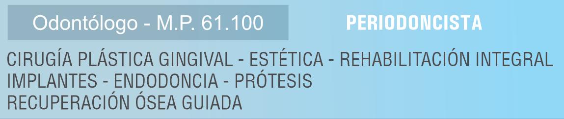 El odontólogo jorge Palavecino es especialista en periodoncia, implantología oral, estética y rehabilitación integral protésica, y también diplomado en Cirugía Plástica Periodontal e Implatología Oral, atendiendo a sus pacientes en su consultorio ubicado en Italia 118.