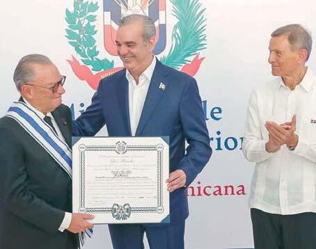 SANTO DOMINGO. El presidente Luis Abinader condecoró ayer al empresario y propulsor del turismo dominicano, Frank Rainieri Marranzini, fundador del Grupo Puntacana, con la Orden del Mérito de Duarte, Sánchez y Mella en el grado de Gran Cruz, Placa de Plata, la principal distinción otorgada por el Estado dominicano. El mérito, contenido en el decreto 489-25 que se publicó en agosto, reconoce su labor como embajador extraordinario y plenipotenciario de la Soberana y Militar Orden Hospitalaria de San Juan de Jerusalén, de Rodas y de Malta en el país, así como su contribución al fortalecimiento de las relaciones bilaterales con esa representación diplomática.
