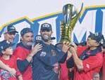 0 Luis Rojas (derecha), celebra junto a Albert Pujols y Luis Miguel Bonetti la corona 17 del Escogido.