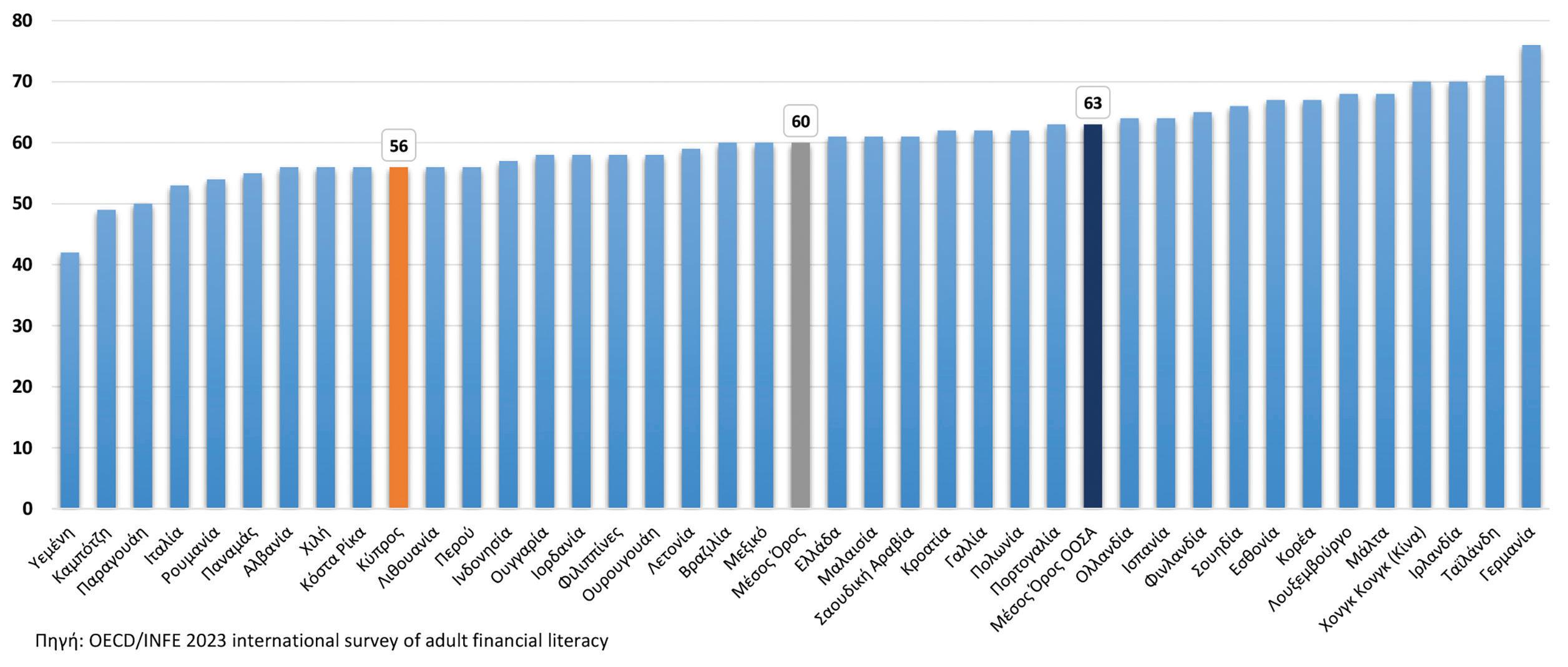 24 EconomyToday ΣΥΝΕΝΤΕΥΞΗ προς τον οικονομικό αποκλεισμό, ιδιαίτερα των ευάλωτων ομάδων. Σύμφωνα με τα αποτελέσματα της προαναφερθείσας παγκύπριας έρευνας του ΟΟΣΑ σε συνεργασία με την ΚΤΚ, το 2023, ο κίνδυνος οικονομικού αποκλεισμού για ένα σημαντικό μέρος της κοινωνίας διαφάνηκε να είναι μεγάλος. Αναλυτικότερα, το 2023 ο μέσος όρος βαθμολογίας Χρηματοοικονομικού Αλφαβητισμού στην Κύπρο ήταν 56 στα 100, με τον μέσο όρο των συμμετεχουσών χωρών μελών του ΟΟΣΑ να είναι 63 στα 100 (Διάγραμμα 1). Η βαθμολογία για τον Ψηφιακό