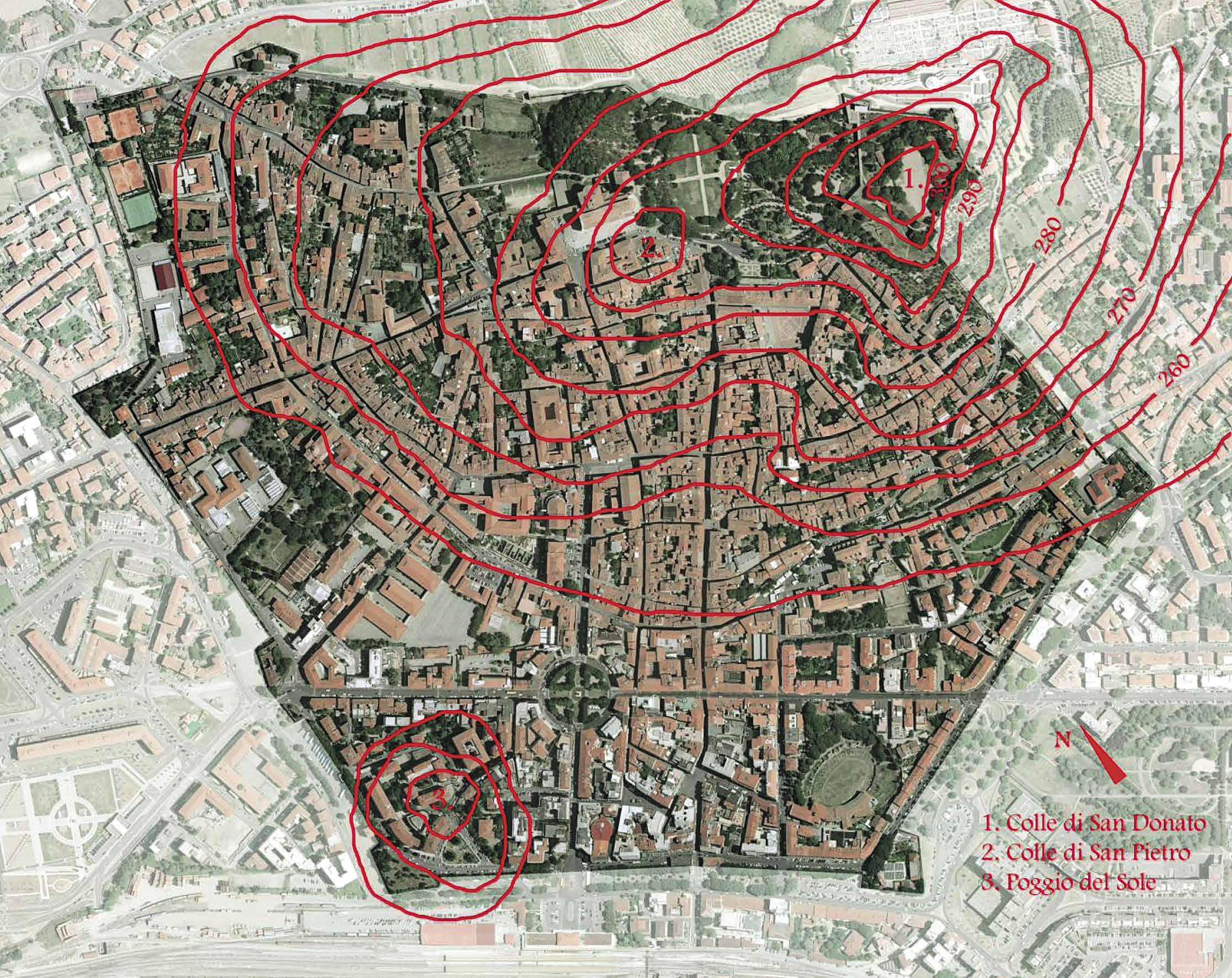 Da un’analisi morfologica la città di Arezzo si presenta, nella parte intramuraria, come un centro originatosi e diffusosi sul piccolo sistema collinare composto dalle sue due alture principali: il colle di San Pietro, in cui troviamo la Cattedrale e quello di San Donato, dove si colloca invece la Fortezza Medicea. Tutto attorno si dipartono le direttrici viarie che conducono rispettivamente: in direzione nord in Casentino, ad ovest nel Valdarno ed ancora fino a Firenze, a sud in Valdichiana in direzione per Roma ed infine ad est, dove si accentuano lievemente i rilievi, nella Valtiberina. L’espansione di Arezzo nei secoli si è articolata in maniera che la città si sviluppasse fondamentalmente in direzione sud-ovest in forma di semicerchi concentrici facendole assumere quella particolare forma a ventaglio, che, seguendo le curve orografiche, degrada e si dilata dove il territorio presenta un andamento pressoché pianeggiante. Nelle strutture di difesa che si sono susseguite, evolvendosi ed adattandosi alle tecniche belliche dei vari periodi storici, possiamo notare come il cuore strategico e militare si sia sempre attestato nel colle dell’attuale Fortezza Medicea, luogo da cui si dipartivano i tracciati delle varie cinte difensive.