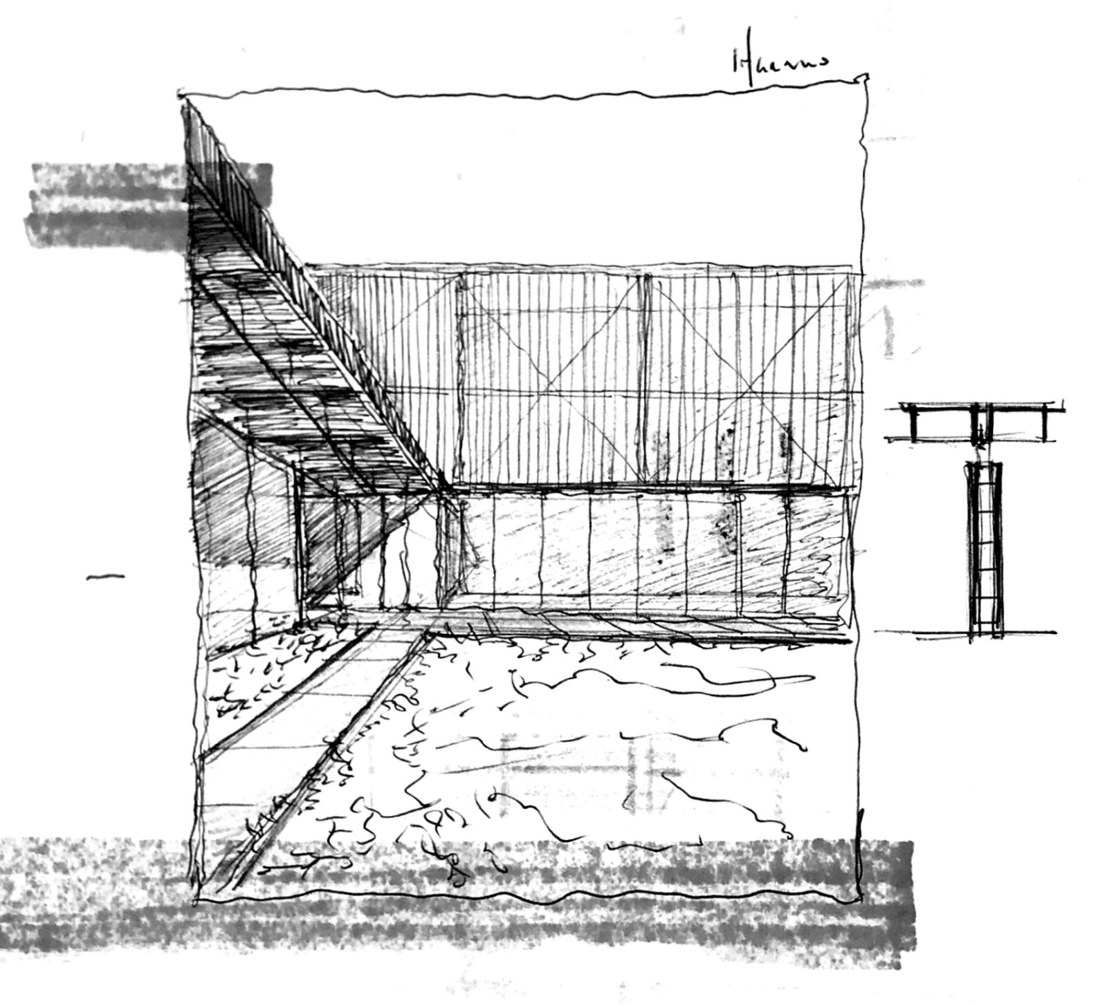 La chiusura del piano primo delineando così il carattere di trasparenza e sincerità strutturale del ‘cantiere’ chiude con una copertura piana in cls collaborante e lamiera grecata. Le installazioni e le compartizioni tecniche, sono in-