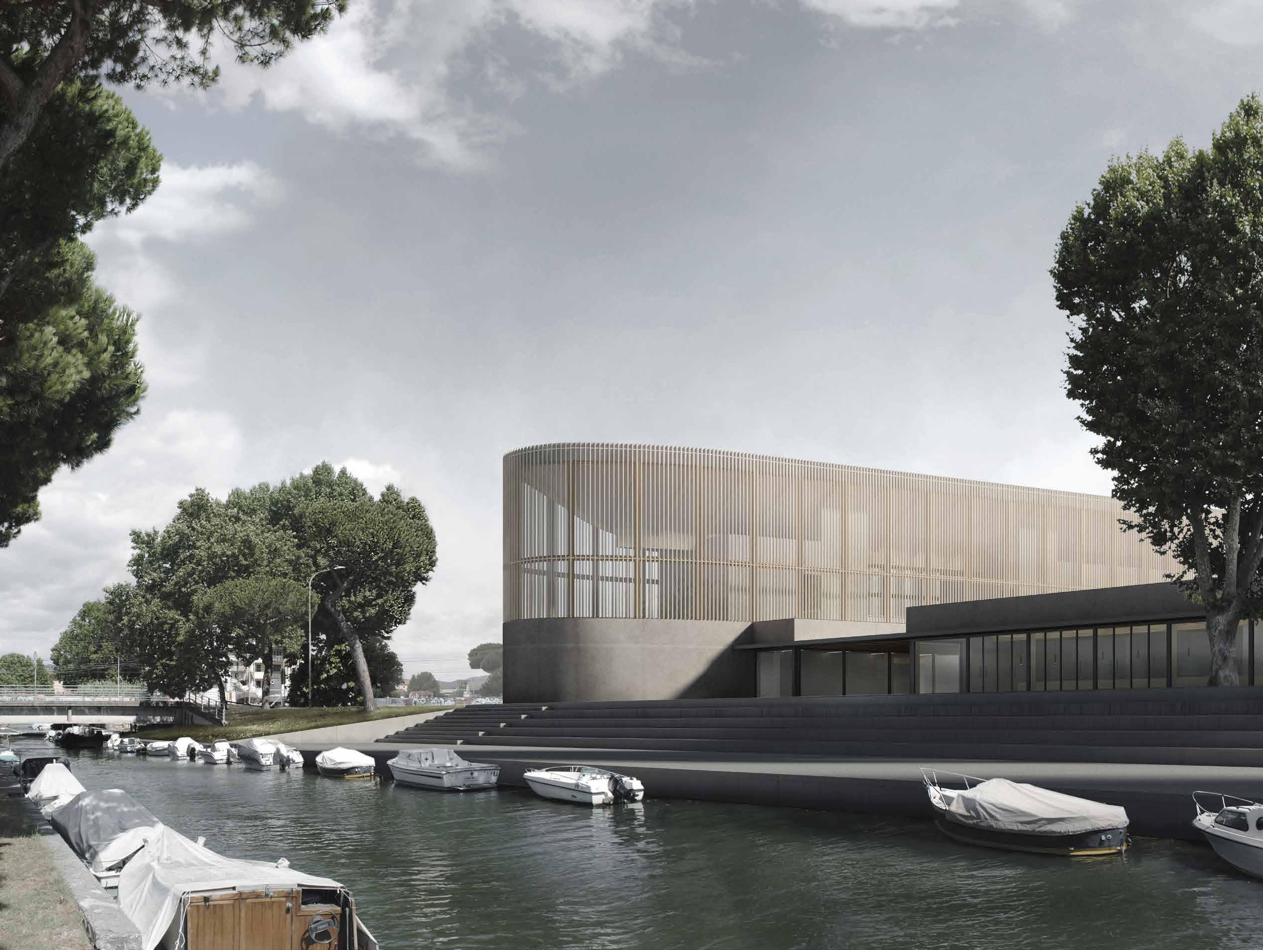 Viareggio, città toscana della Versilia, ha una storia recente. Camminando sulle banchine del canale Burlamacca, la città assume un aspetto nostalgico. Lontani sono i ricordi del primo villaggio cinquecentesco, delle battaglie marinare e delle terre paludose. Il canale porta con sé i “segni” di un intimo rapporto della città con il mare. Elemento di collegamento e divisione delle due anime di Viareggio: la città marinara e cantieristica, la Darsena, e la realtà turistica lungo la costa. Il progetto nasce sulle rive di questa sinuosa linea d’acqua, che scorre dal mare ai monti. Una trasformazione architettonica ed urbana ispirata alle opere dell’artista e scrittore Lorenzo Viani. Un nuovo centro culturale dove memoria storica ed affettiva trovano sovrano riparo sotto le lunghe navi.