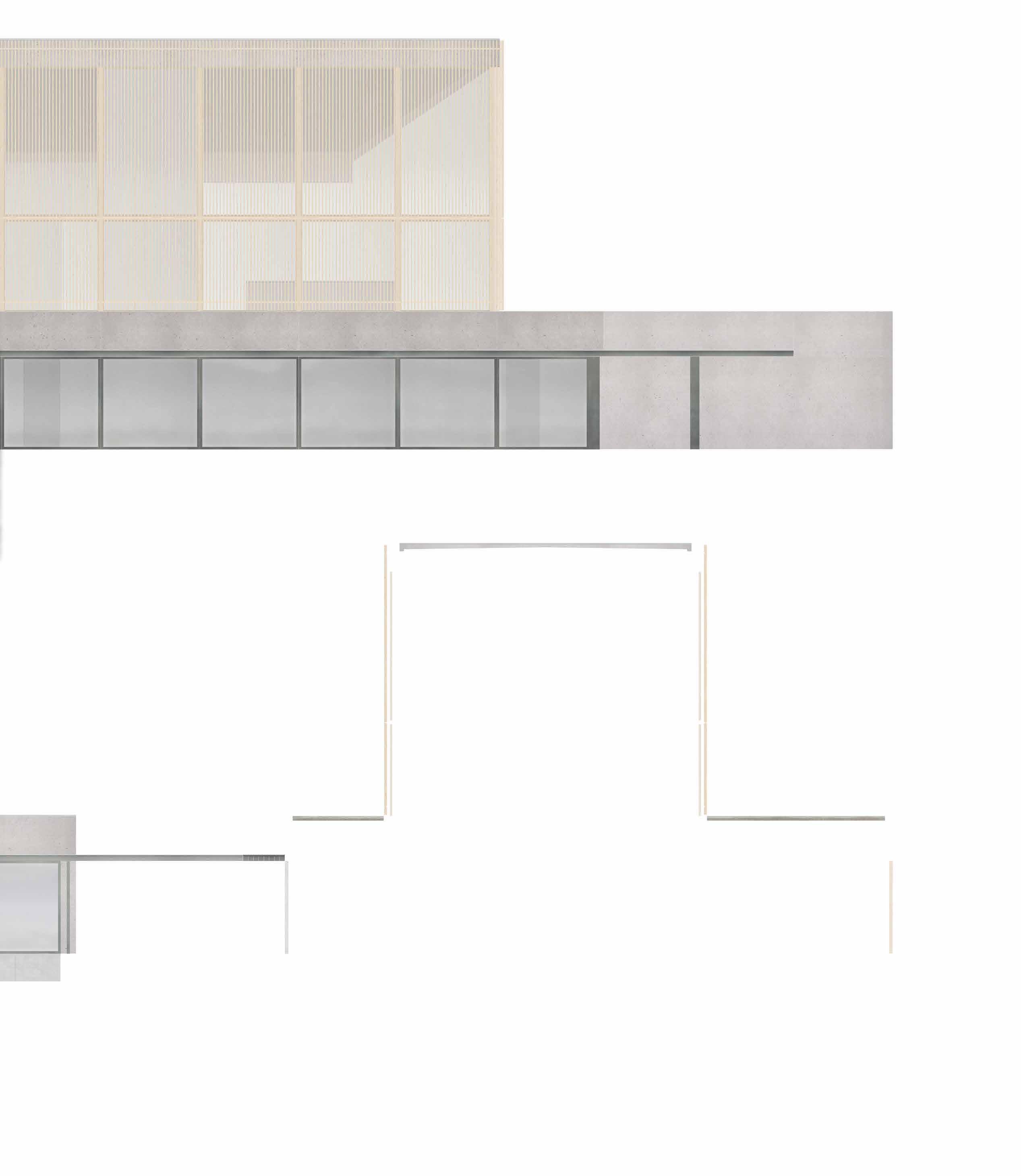 ponenti vetrate. La gelosia in listelli di legno divisa in pannelli, è fissata agli elementi verticali ed orizzontali della facciata tramite una sottostruttura orizzontale che le distanzia dai montanti verticali, consentendo l’apertura a soffietto dei pannelli e la conseguente pulizia esterna delle vetrate. Tra quest’ultimo e la struttura è previsto anche l’installazione di un tende a scomparsa per l’eventuale oscuramento degli ambienti espositivi dalla luce solare (ditta svizzera Kästli Storen AG).