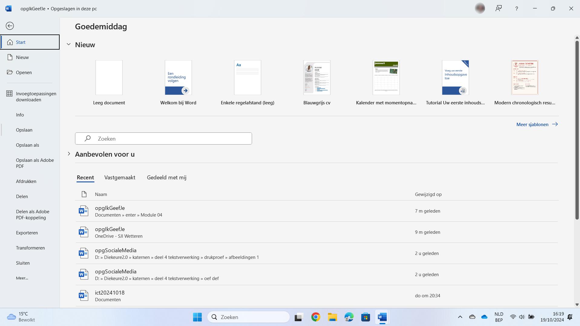 Je komt op de Backstage-weergave van Word. Afhankelijk van jouw Word-versie kan dit er een beetje anders uitzien.