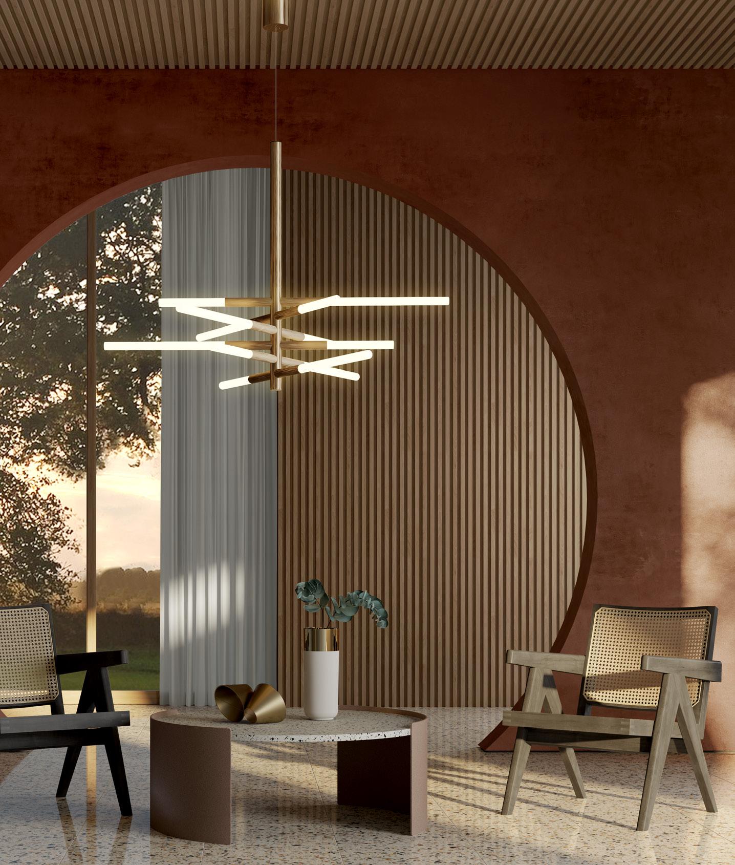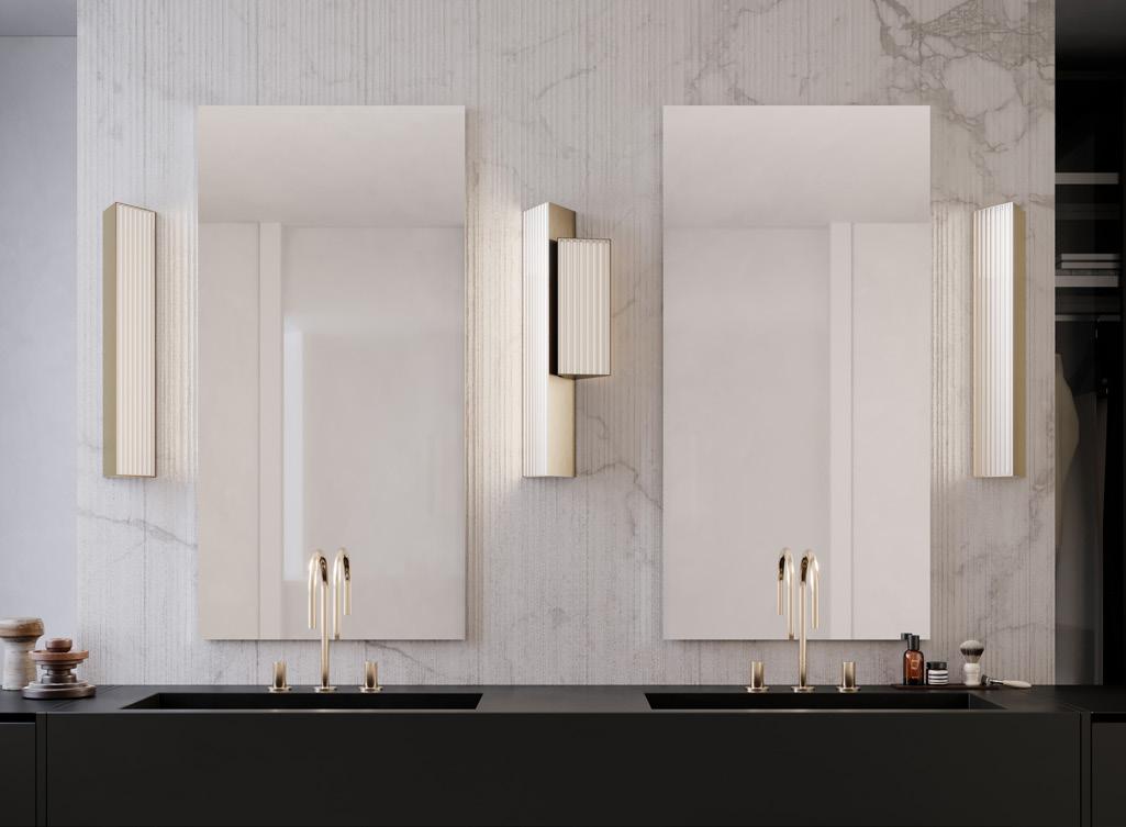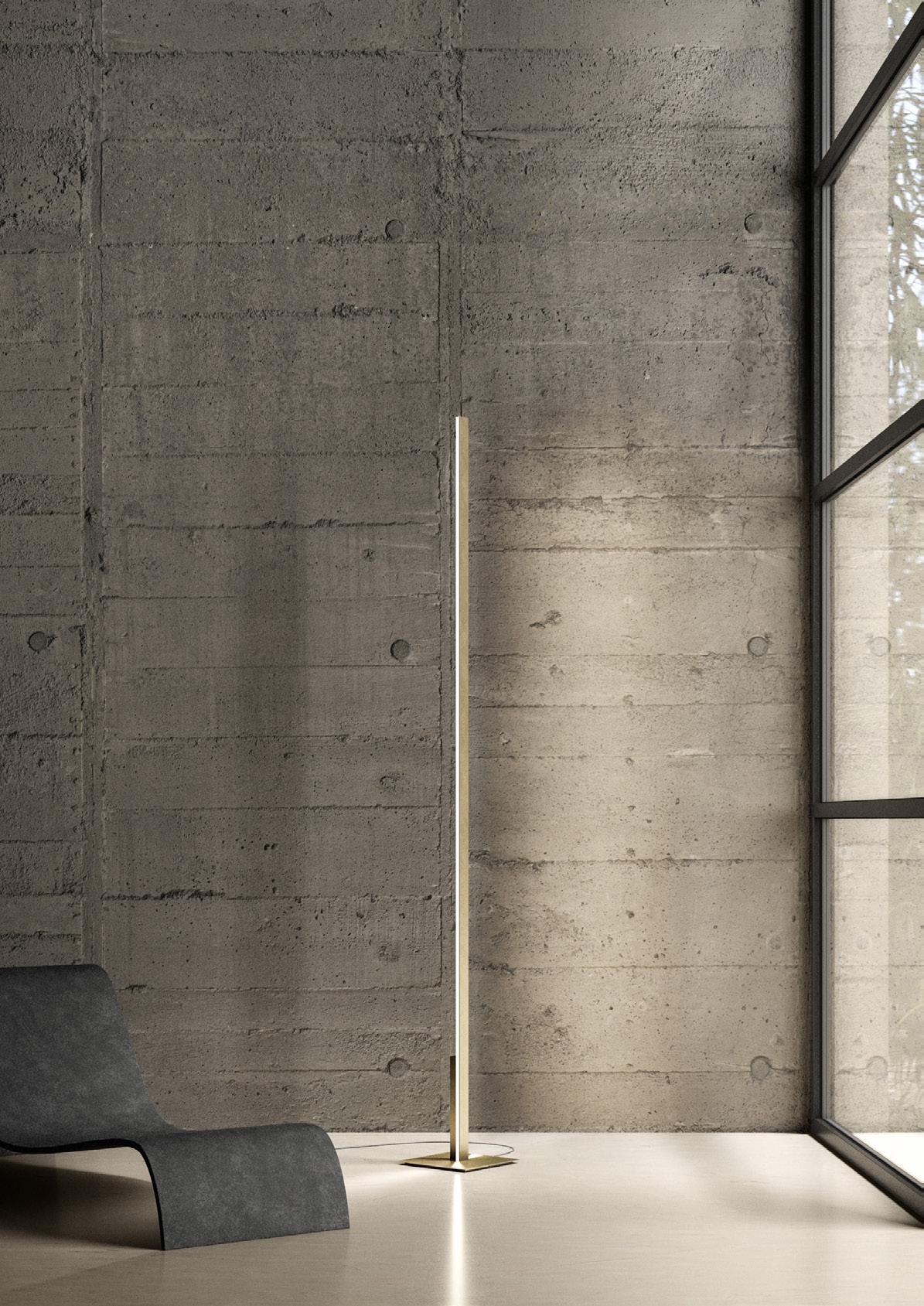 In Stick the light emanates, skillfully modulated, through a diffuser with a ribbed glass effect, contained within a metal extrusion in satin copper and gold nickel finishes.