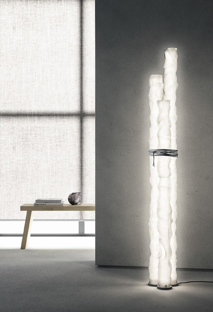 The dual satin polycarbonate diffuser has the irregular appearance of a crumpled paper tube. The soft textile cord, a detail in line with the brand’s archi-decorative stylistic code, supports the lamp in the suspended version and becomes a joining element for the table and floor versions.