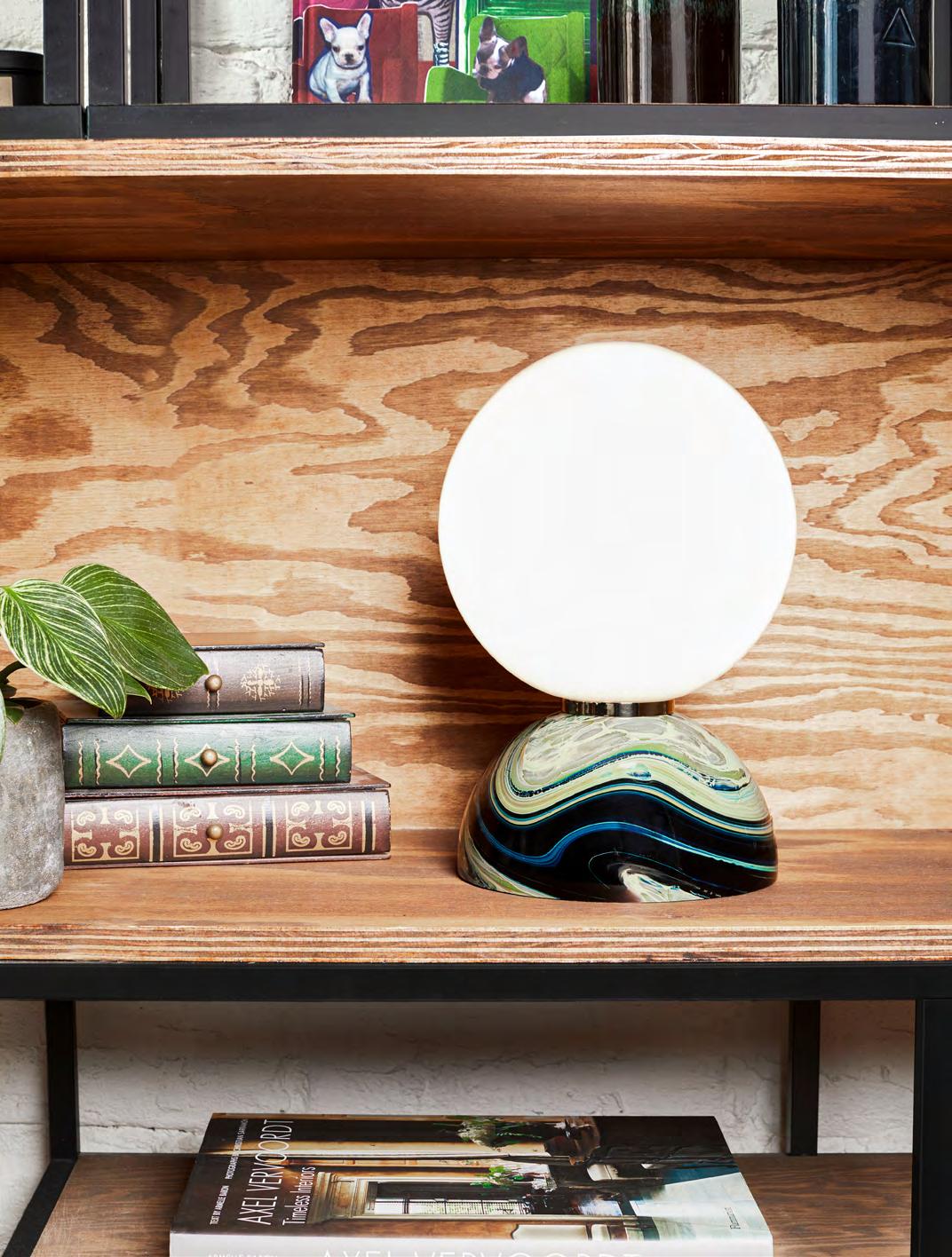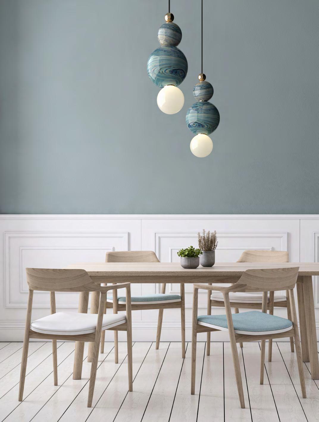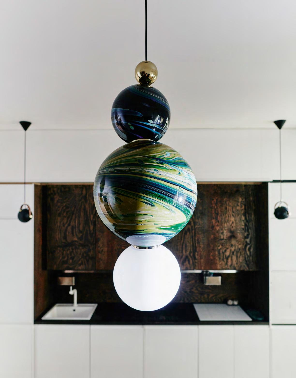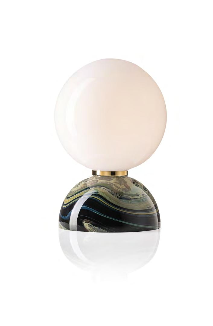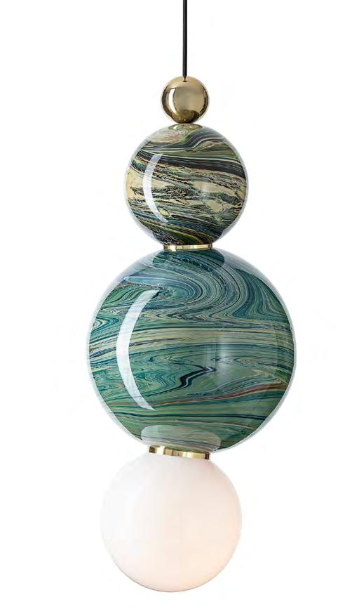 to create the glass spheres. Each sphere has its own distinct markings within its sleek, marble-like finish. Spacey offers pendants in two sizes and a table lamp. The pendants hang perfectly in residential spaces where guests are bound to look into the small microcosm and –as if they were lifting their eyes to the night sky –feel wonder.