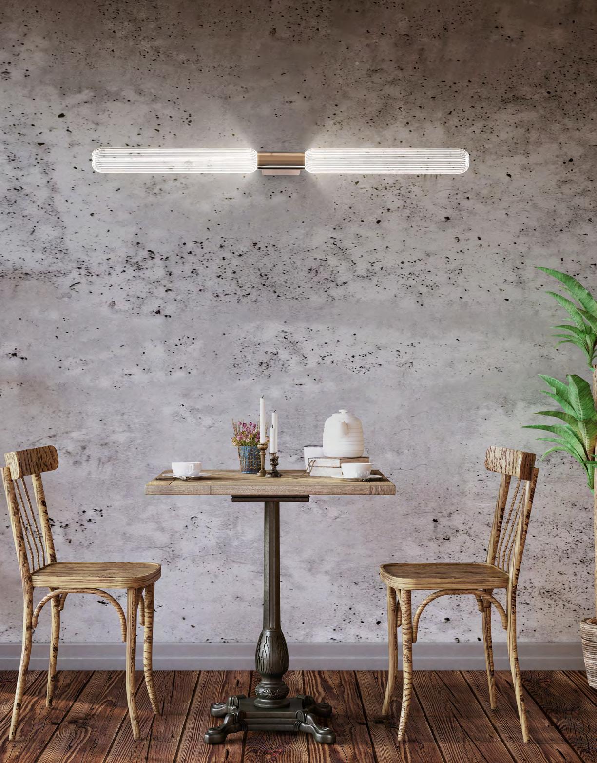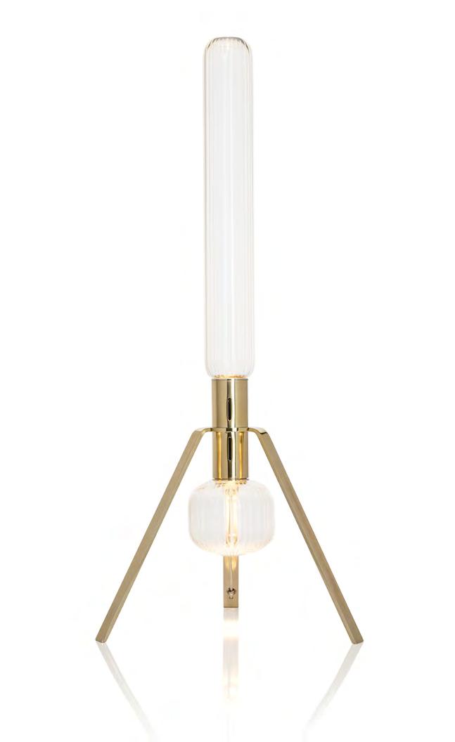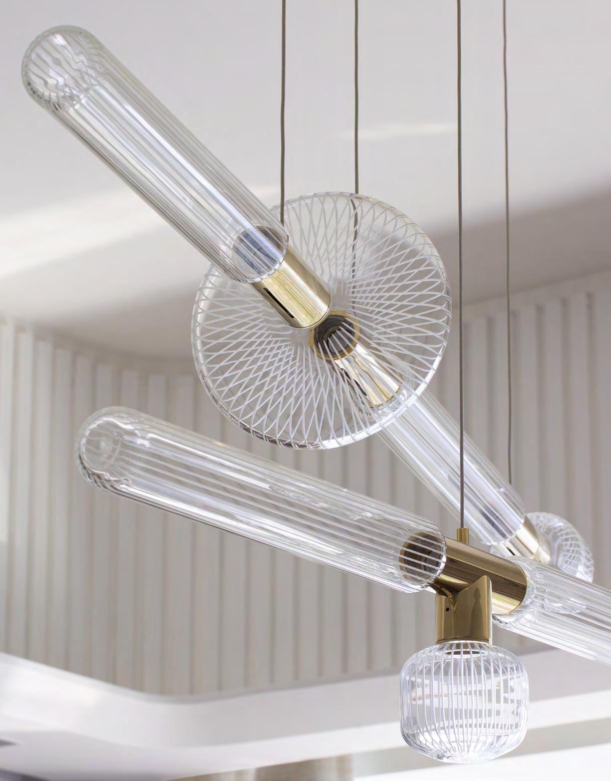The Cipher collection features slender lights, shaped like sunbursts and elongated capsules. Each of the handblown glass bulbs is then meticulously handetched with clean-cut vertical lines by some of the most skilled artisans in the world. The individual crystal tubes erupt from champagne-gold polished brass fittings at the centre of the lights. Within