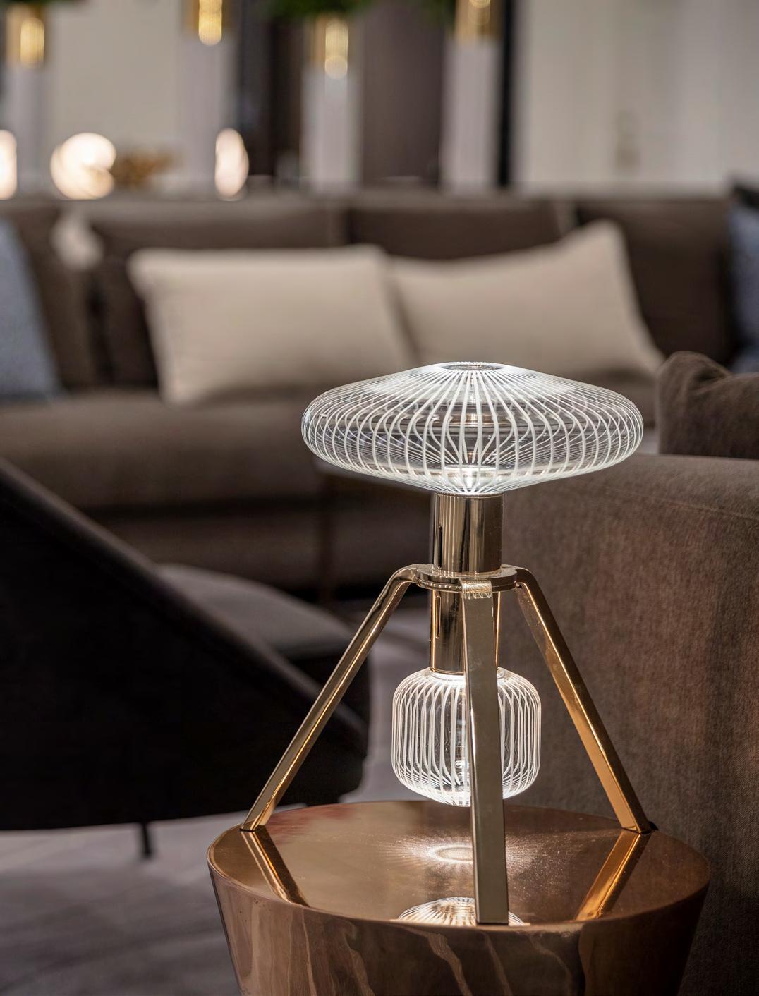 The Glitters collection was created by Czech designer and architect Gabriela Náhlíková, who aims to free her design language from customary perspectives by applying a fresh approach. The Glitters collection builds on the author’s unconventional style by creating “pleats” in the glass in order to play with reflections and shadows. When lit, the light slides in and out