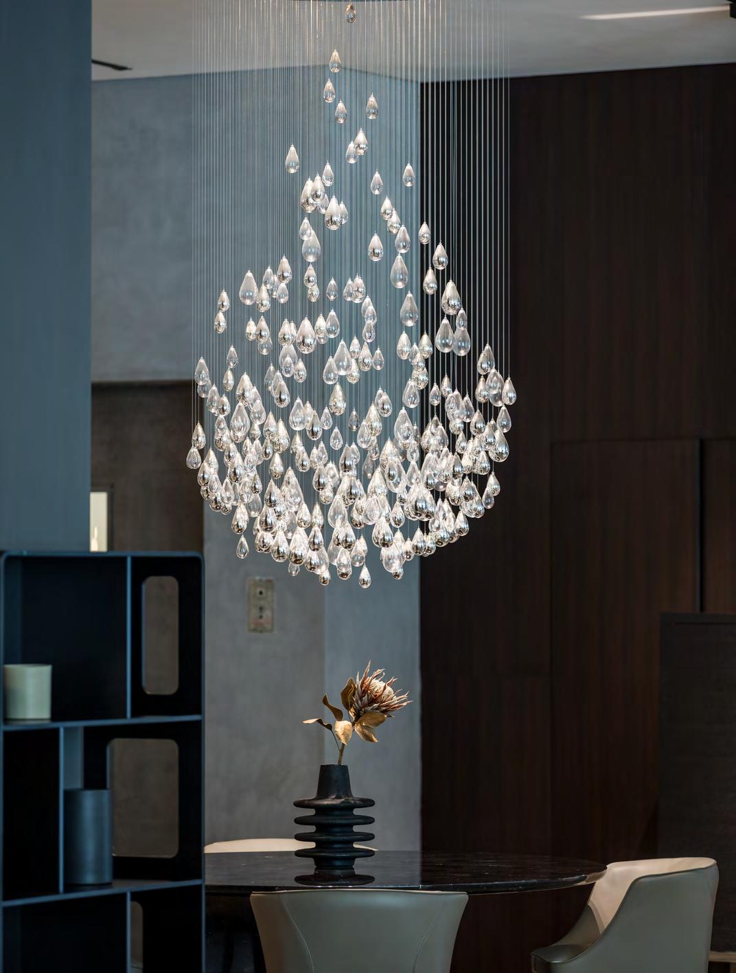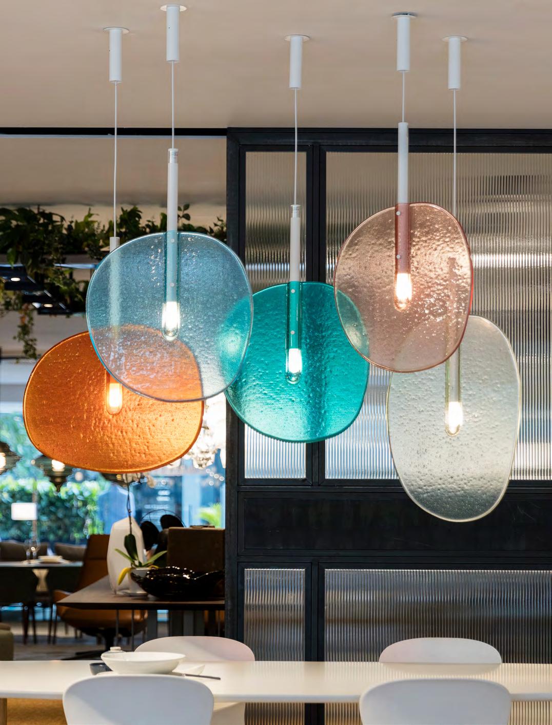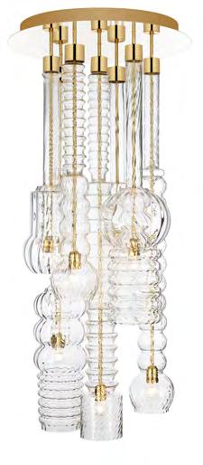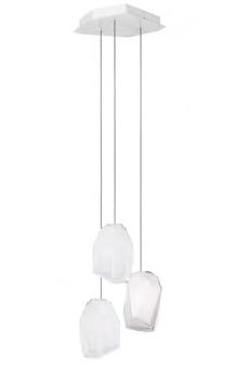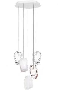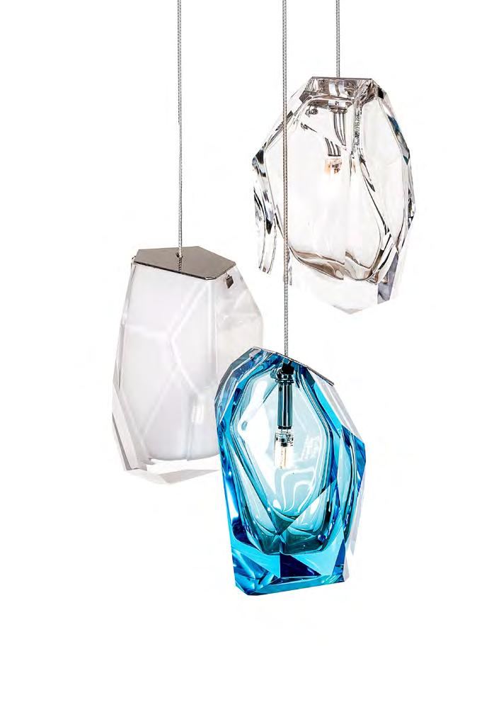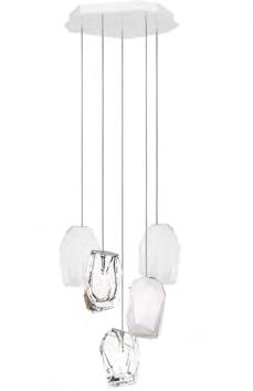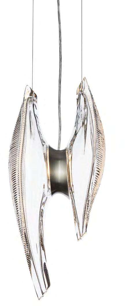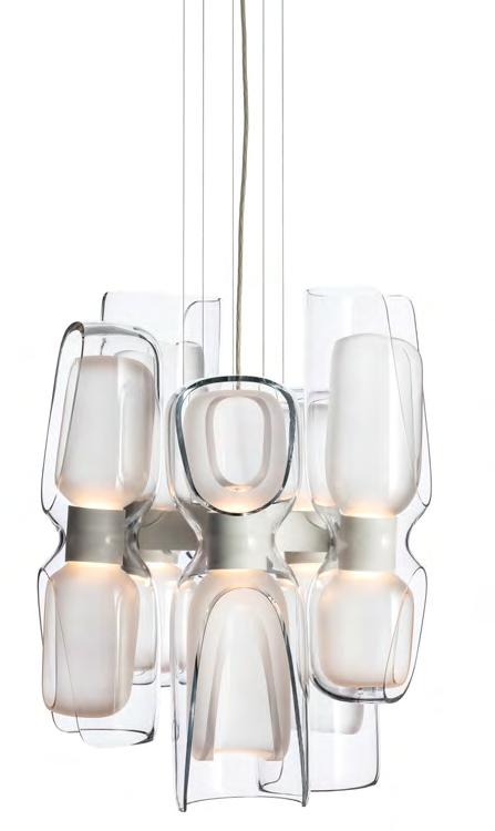 of fifteen glass pieces, joined together in unison to create a stunning, harmonious shape. Each of the glass bodies are suspended at different heights, floating effortlessly above, and creating a playful tugof- war between light and shadow. Over a dining table, the Eve pendant lighting can uplift any dinner ambience to one of seamless sophistication.