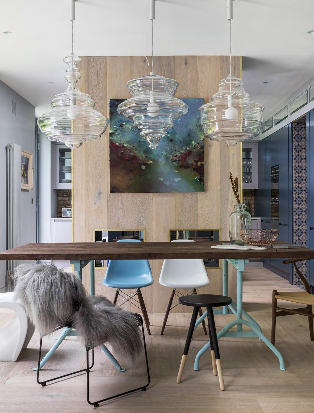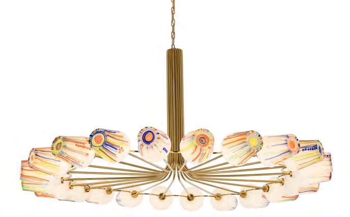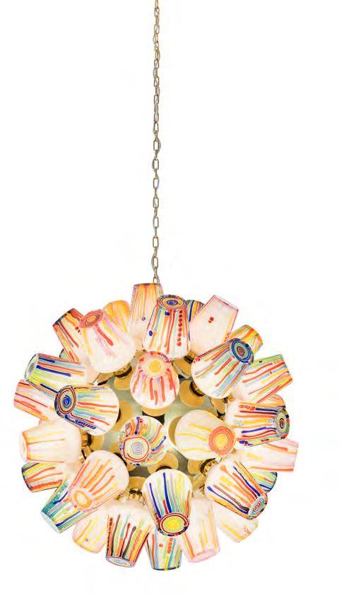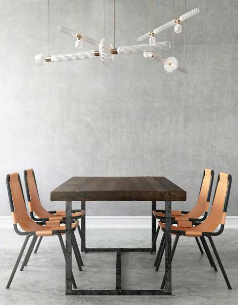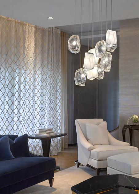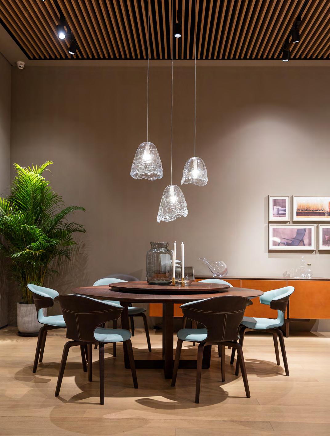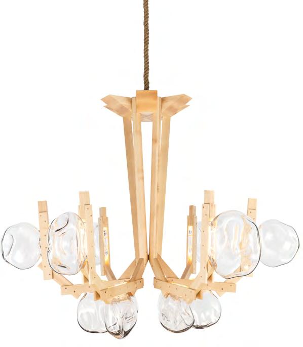 of fifteen glass pieces, joined together in unison to create a stunning, harmonious shape. Each of the glass bodies are suspended at different heights, floating effortlessly above, and creating a playful tugof- war between light and shadow. Over a dining table, the Eve pendant lighting can uplift any dinner ambience to one of seamless sophistication.