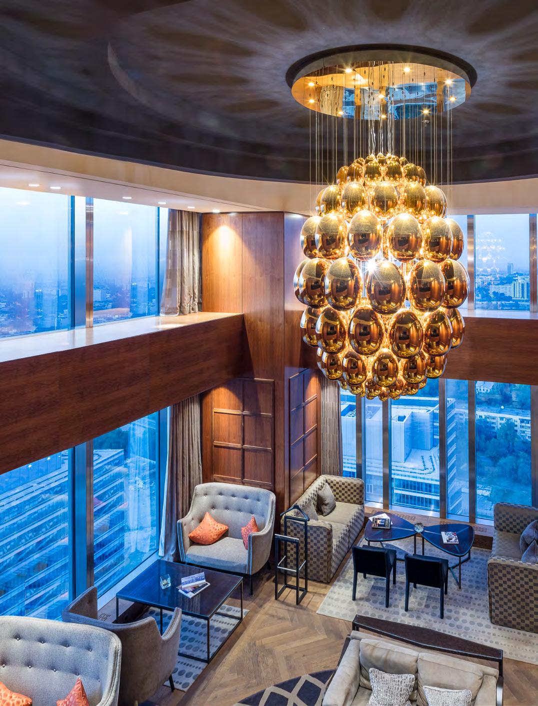 youthful – even after 20+ years. Perhaps it is because of the way light glides sleekly through the polished cylinders of the sculpture when lit. The lighting becomes a colossal, albeit refined, fixture and a distinctive experience.