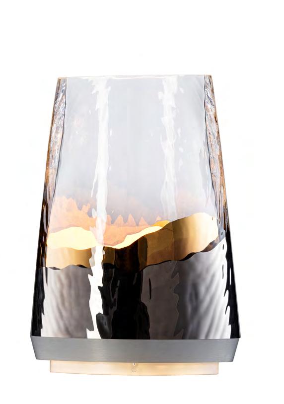 by Kengo Kuma Table Lamp CL035TA Weight / 5,2 kg / 11,5 lbs Primary Material / Hand Blown Glass LED CUSTOM Finishes / Metal Parts Brushed Stainless Steel Certification / CE Colors 01 E14 CE E12 UL LED