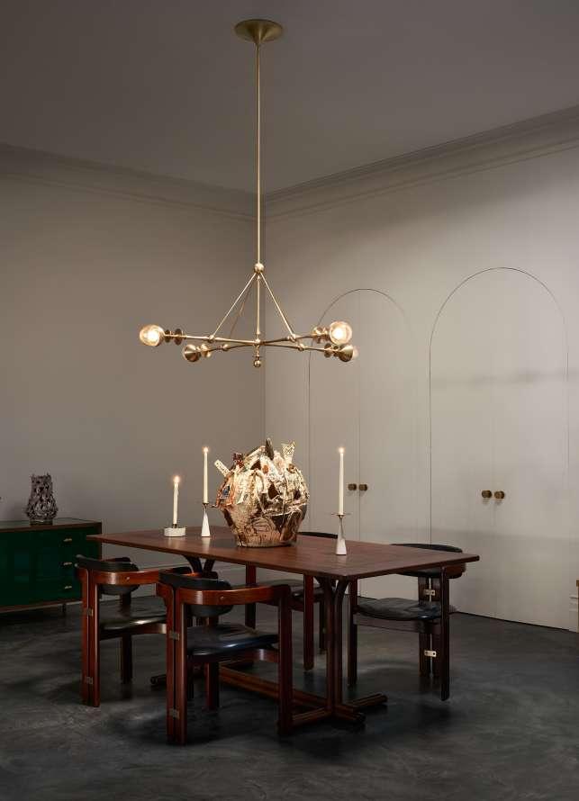 Roll & Hill's designs draw from a rich material palette, including brass, bronze, leather, wood, hand-knotted rope, and mouth-blown glass. Roll & Hill's designers often pair historical elements with contemporary forms to create objects that feel familiar yet totally new.