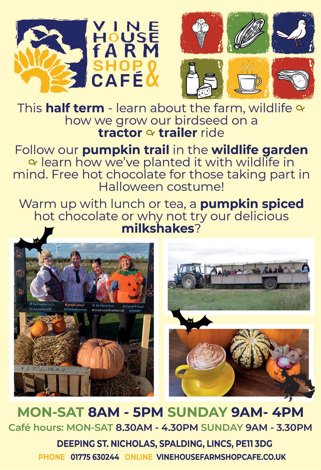 Vine House Farm at Deeping St Nicholas is getting in the spirit of the Halloween season with a pumpkin trail around the wildlife garden. Encourage the kids to dress up in Halloween costume and they’ll get a free children’s hot chocolate. They’ll be selling pumpkin spiced hot chocolates and milkshakes as well as all their usual snacks and refreshments. Encourage the kids to dress up in Halloween costume and they’ll get a free children’s hot chocolate.