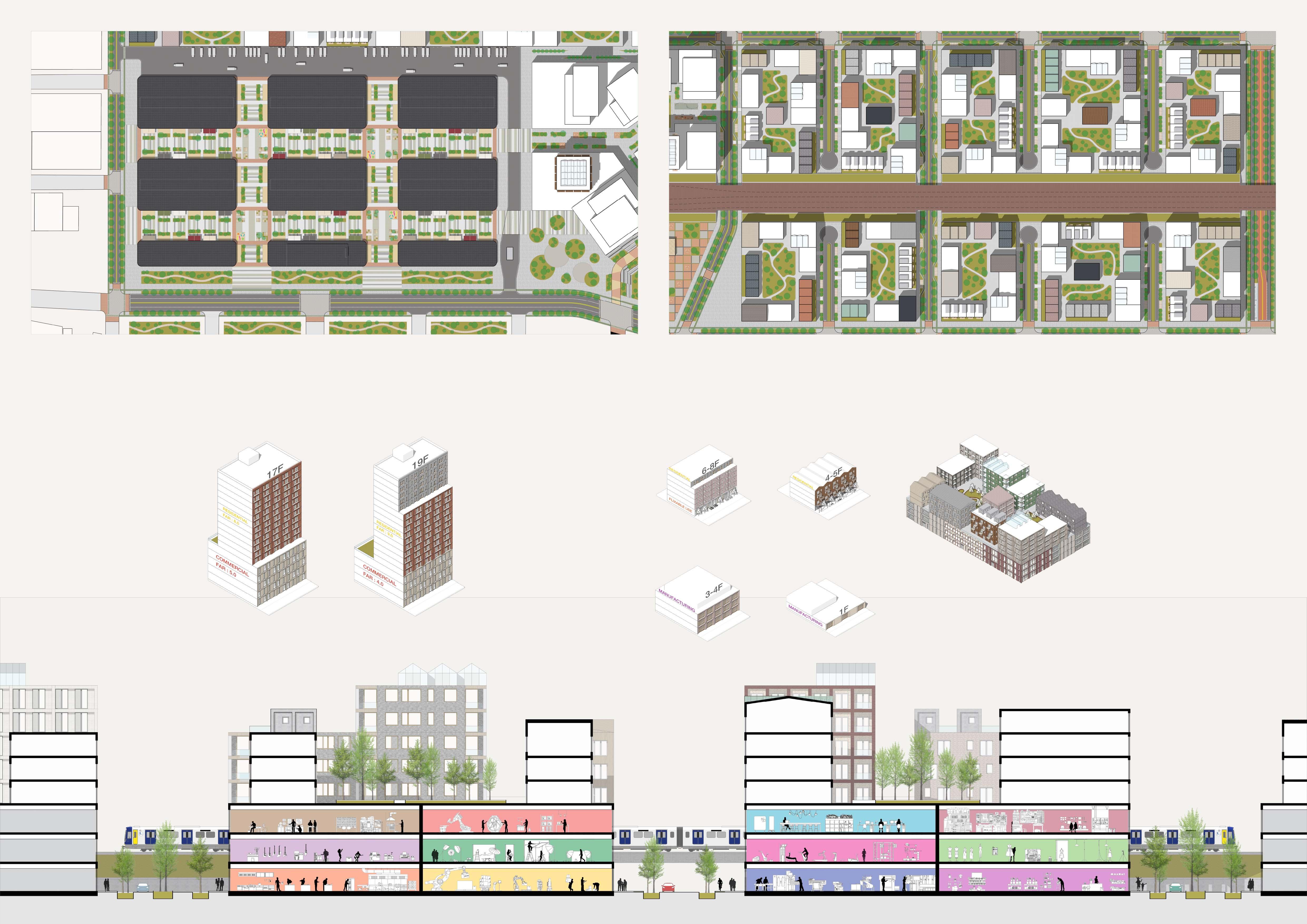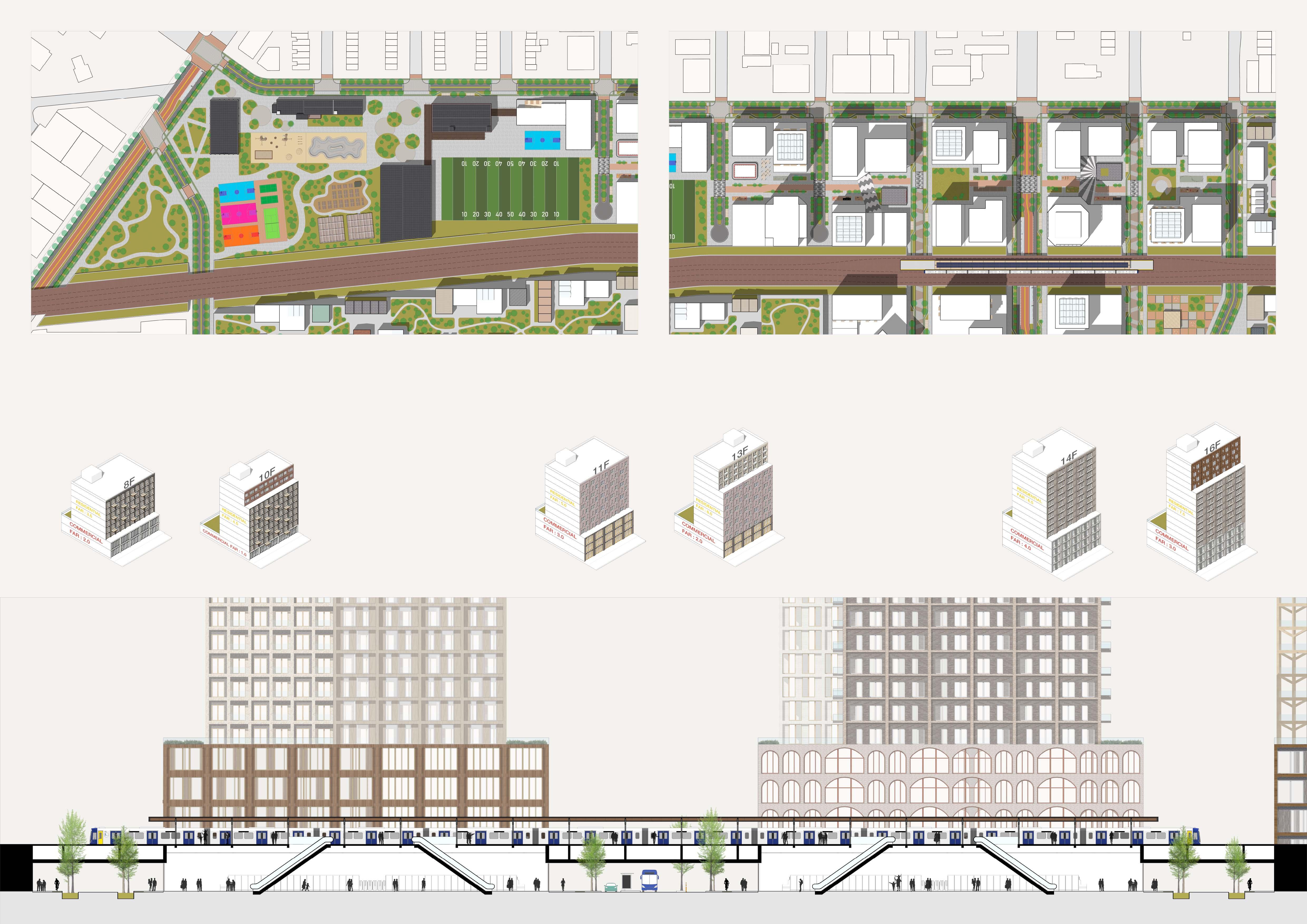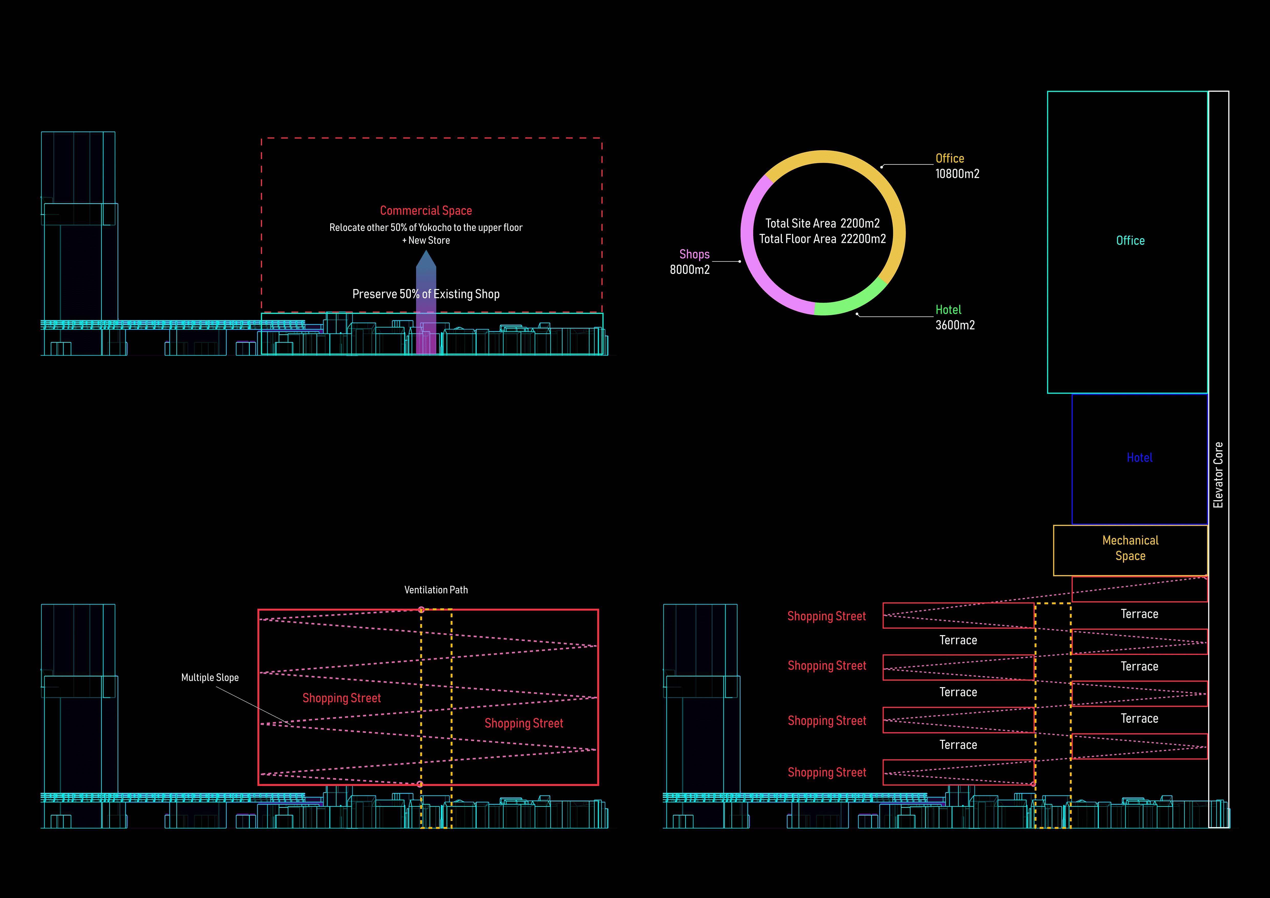The core architectural concept was centered on the idea of a neighborhood as a social place where interaction between people is encouraged through the use of scale. Under this mindset, 50% of the existing storefronts will be preserved, and the other 50% of the original street will be relocated to the upper floor. The newly designed shopping street will be divided into two parts, each sharing a platform that functions as a stopover and social space.