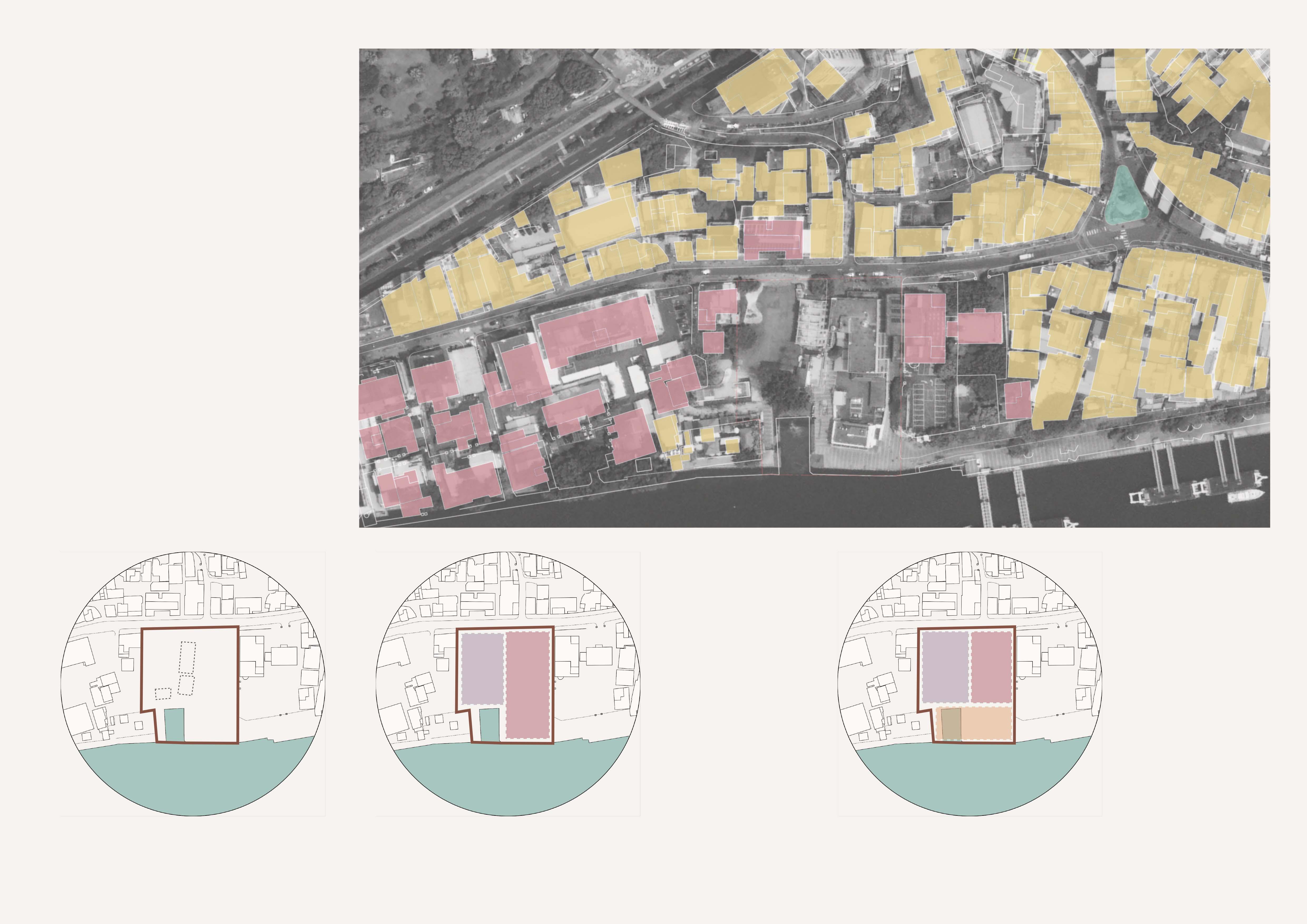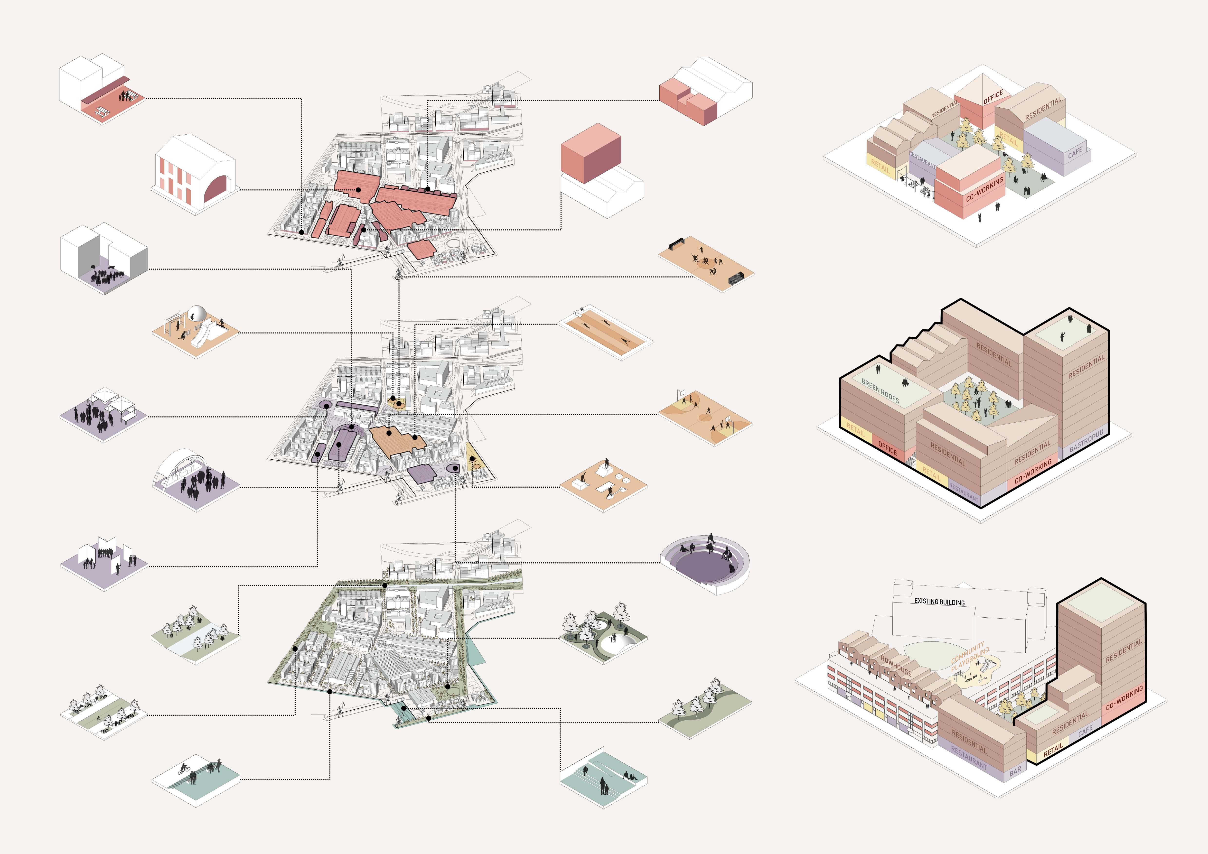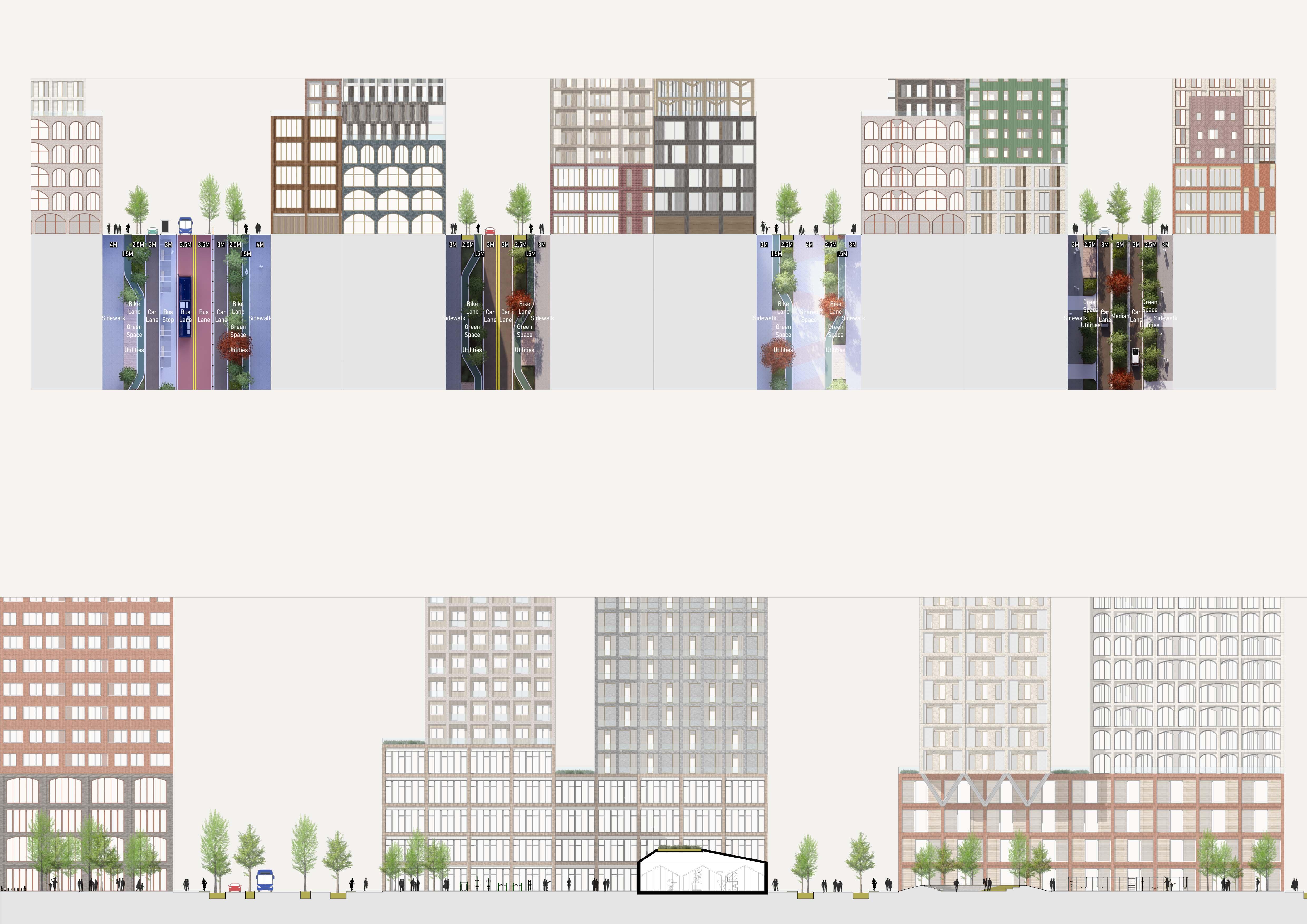 The core architectural concept was centered on the idea of a neighborhood as a social place where interaction between people is encouraged through the use of scale. Under this mindset, 50% of the existing storefronts will be preserved, and the other 50% of the original street will be relocated to the upper floor. The newly designed shopping street will be divided into two parts, each sharing a platform that functions as a stopover and social space.