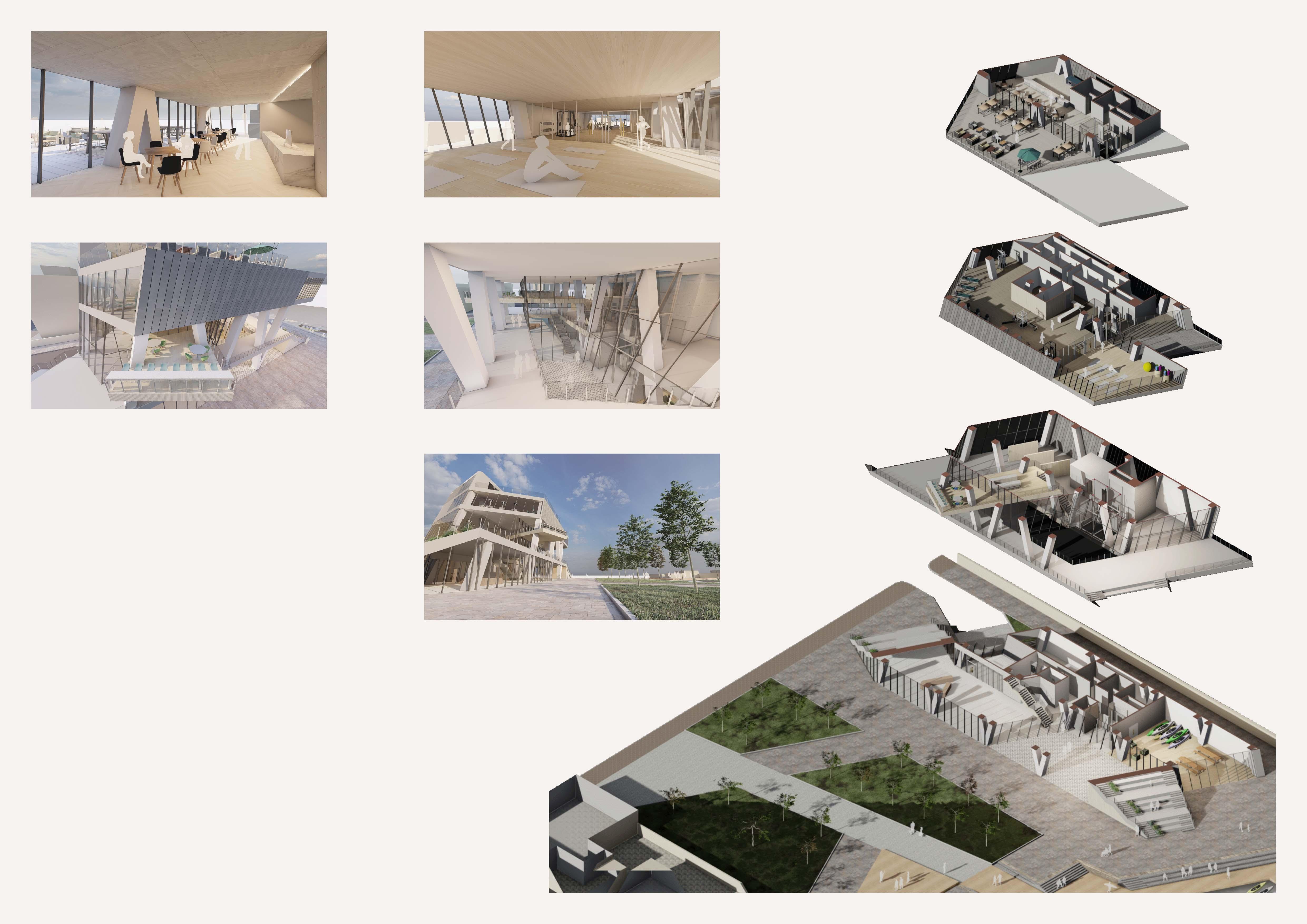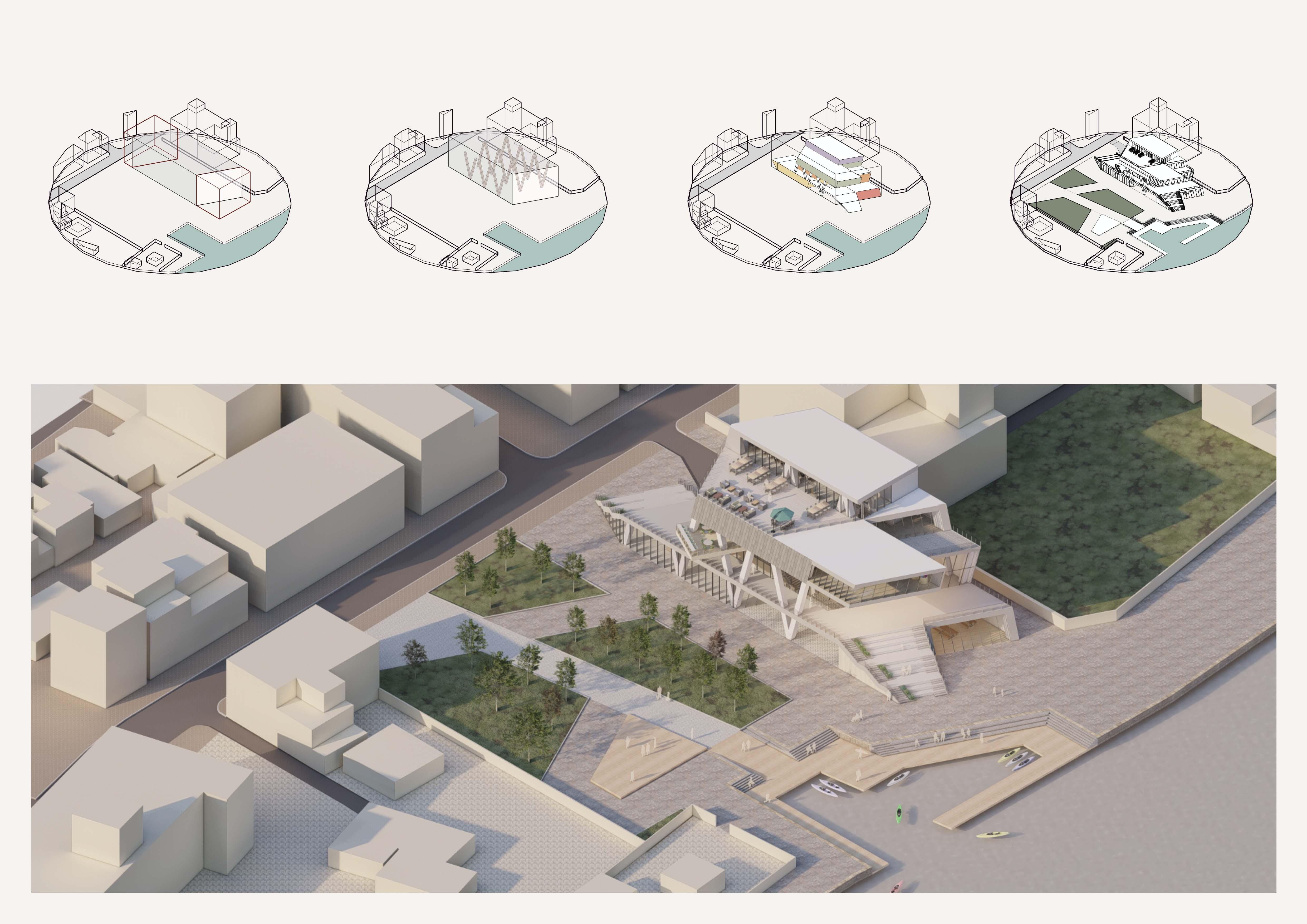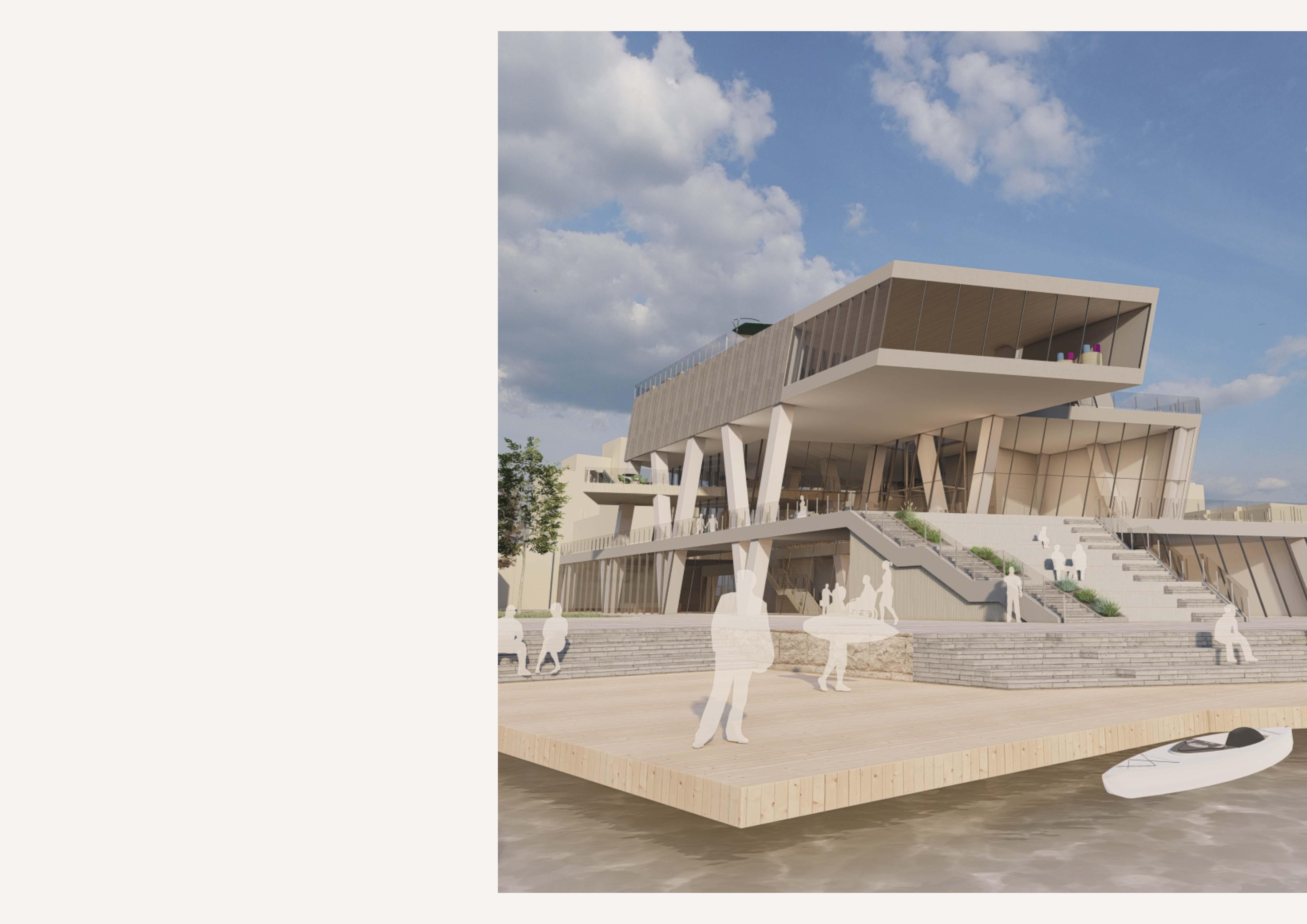 Throughout the design development process, the view from the riverside and the surrounding area took precedence. As a result, the staircases function as spectator seating with a direct connection to the river. On the side of the building, a semi-public courtyard is protected from wind and has good sun conditions, allowing for recreational activities. By reshaping the layout of the pier, a small inner harbor was created for the local kayak club and water-related activities.