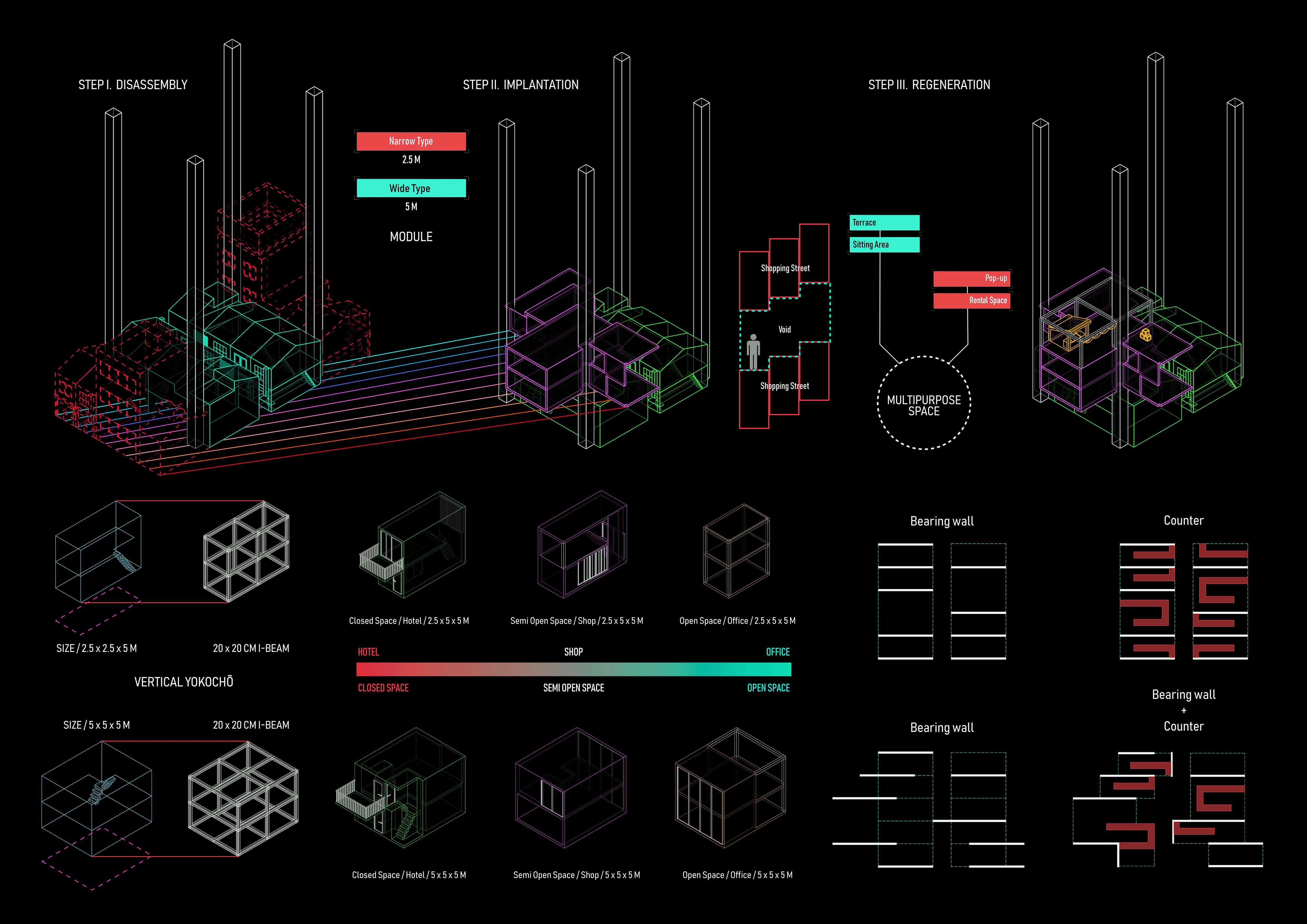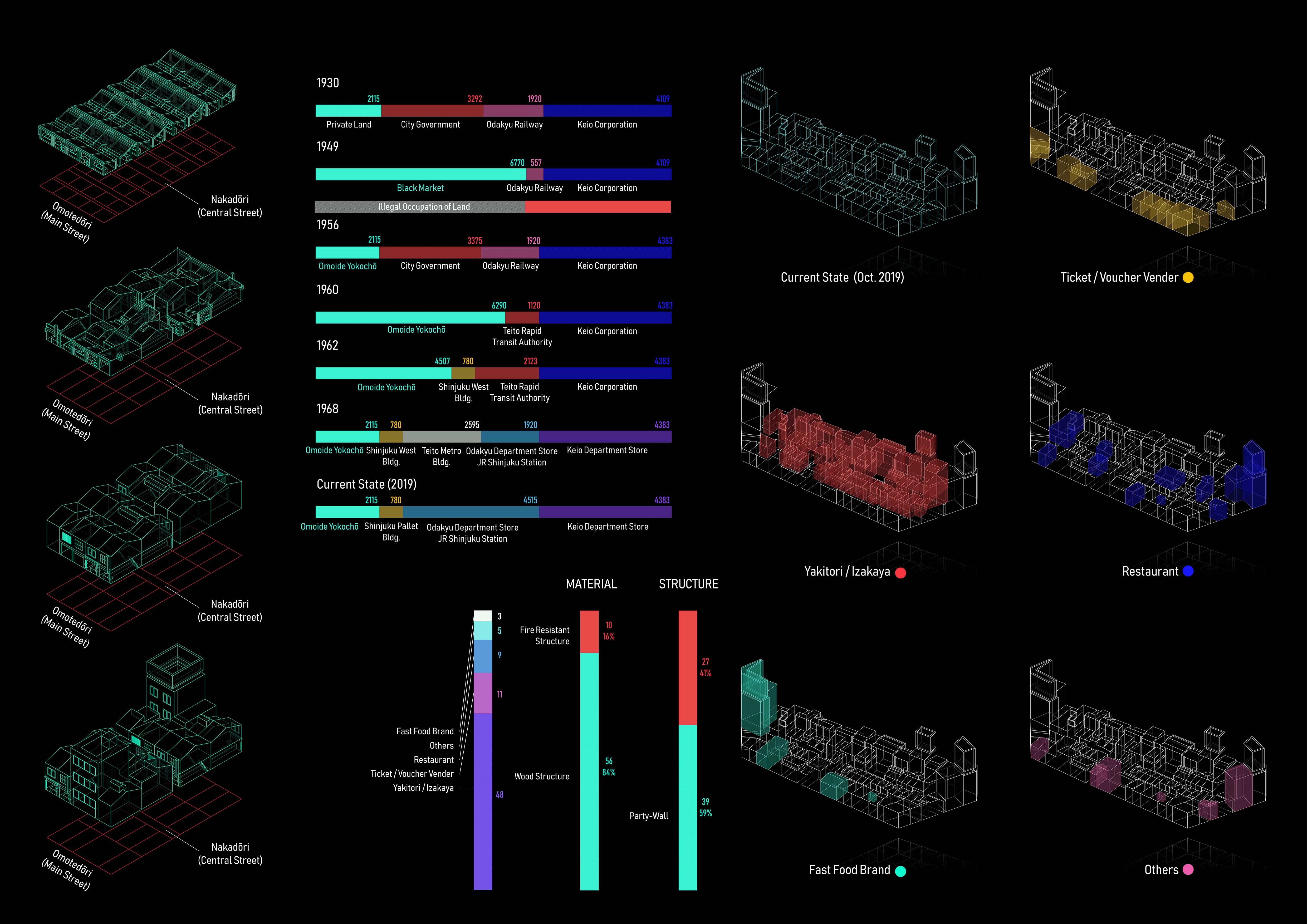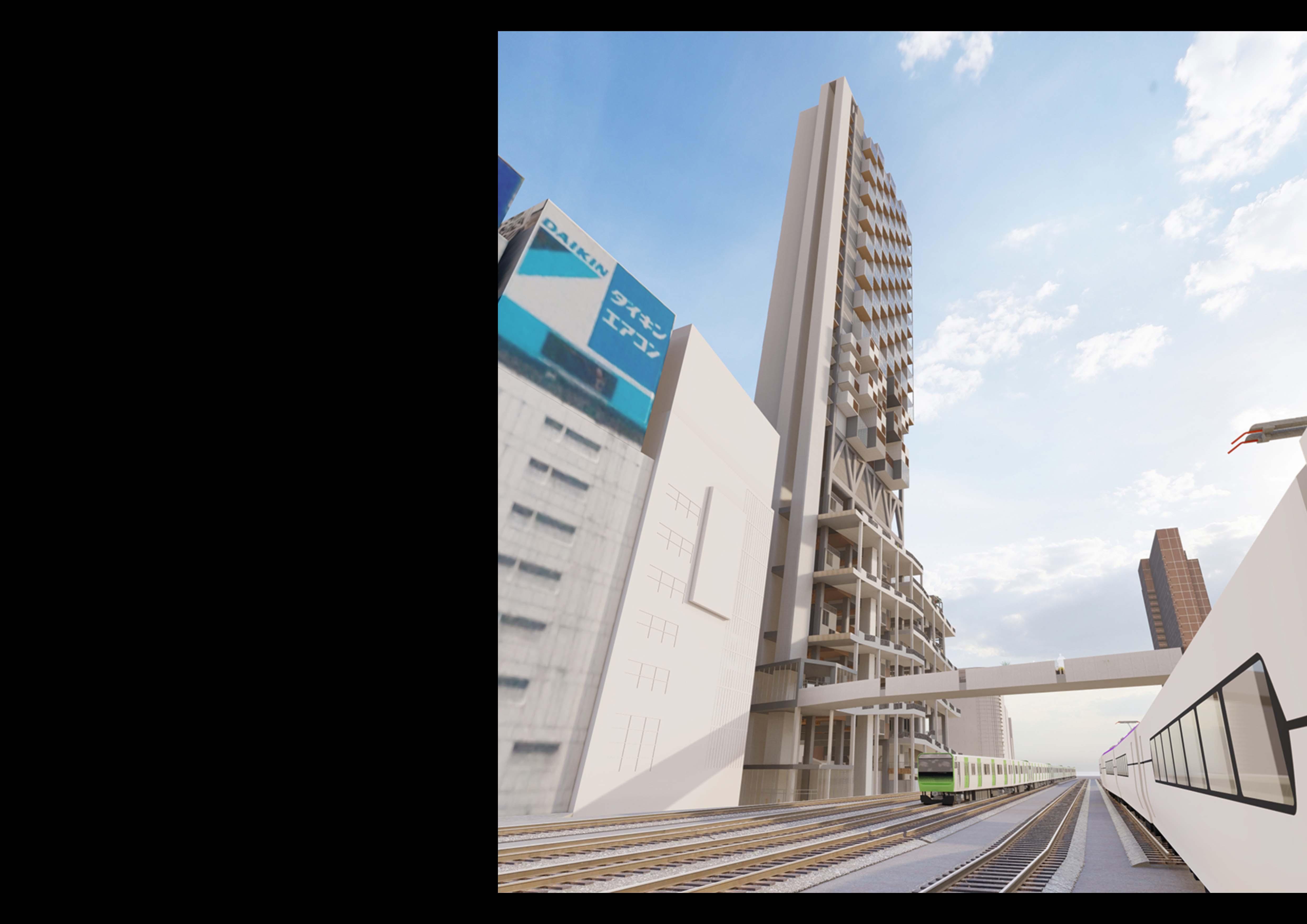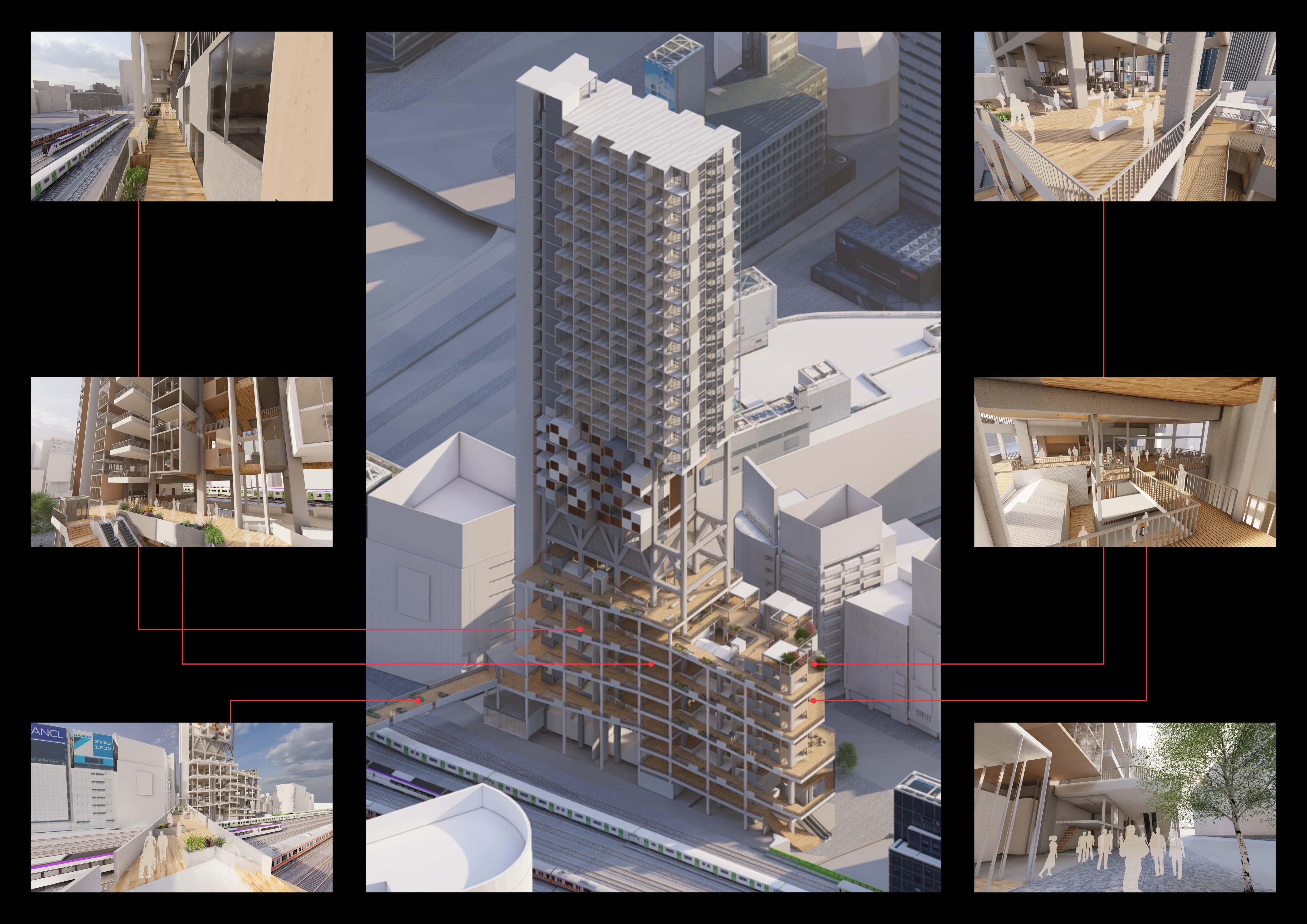 This project proposes a new kind of transit-oriented development (TOD) that honors the district's heritage while embracing the needs of a modern city. "Saisei" (再生), meaning "rebirth" or "regeneration" in Japanese, captures the project's core intent—to revitalize the spirit of Omoide Yokocho without erasing its history. Rather than replace or sanitize the area, the design integrates new mixed-use functions into the existing urban texture, creating a layered environment supporting continuity and evolution. The resulting complex acts as both a connective transit node and a cultural landmark, preserving memory while enabling new possibilities. By weaving together transportation, commercial use, and historical continuity, the project seeks to create a resilient, adaptive urban node that enhances connectivity while celebrating the rich urban fabric of downtown Tokyo.