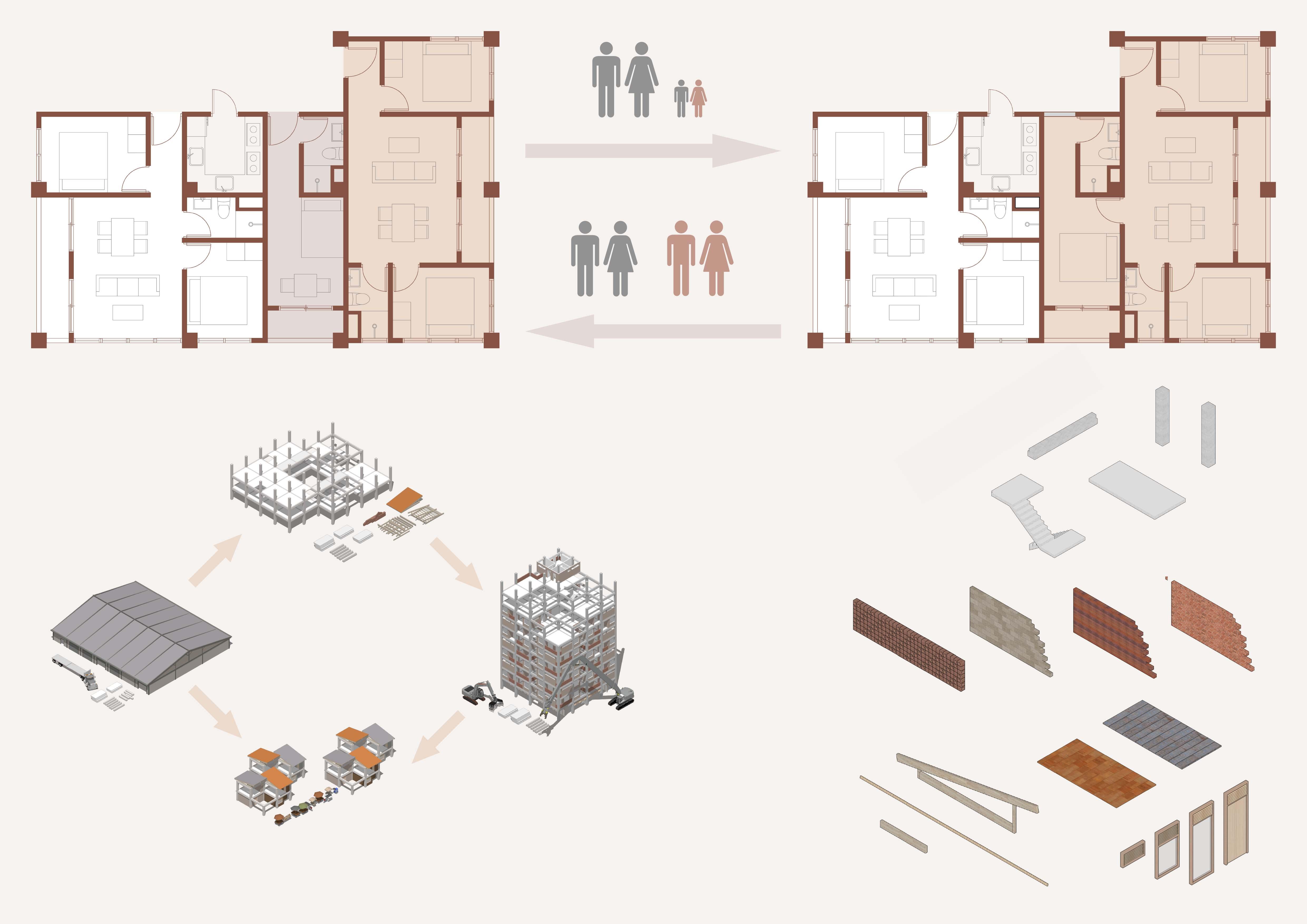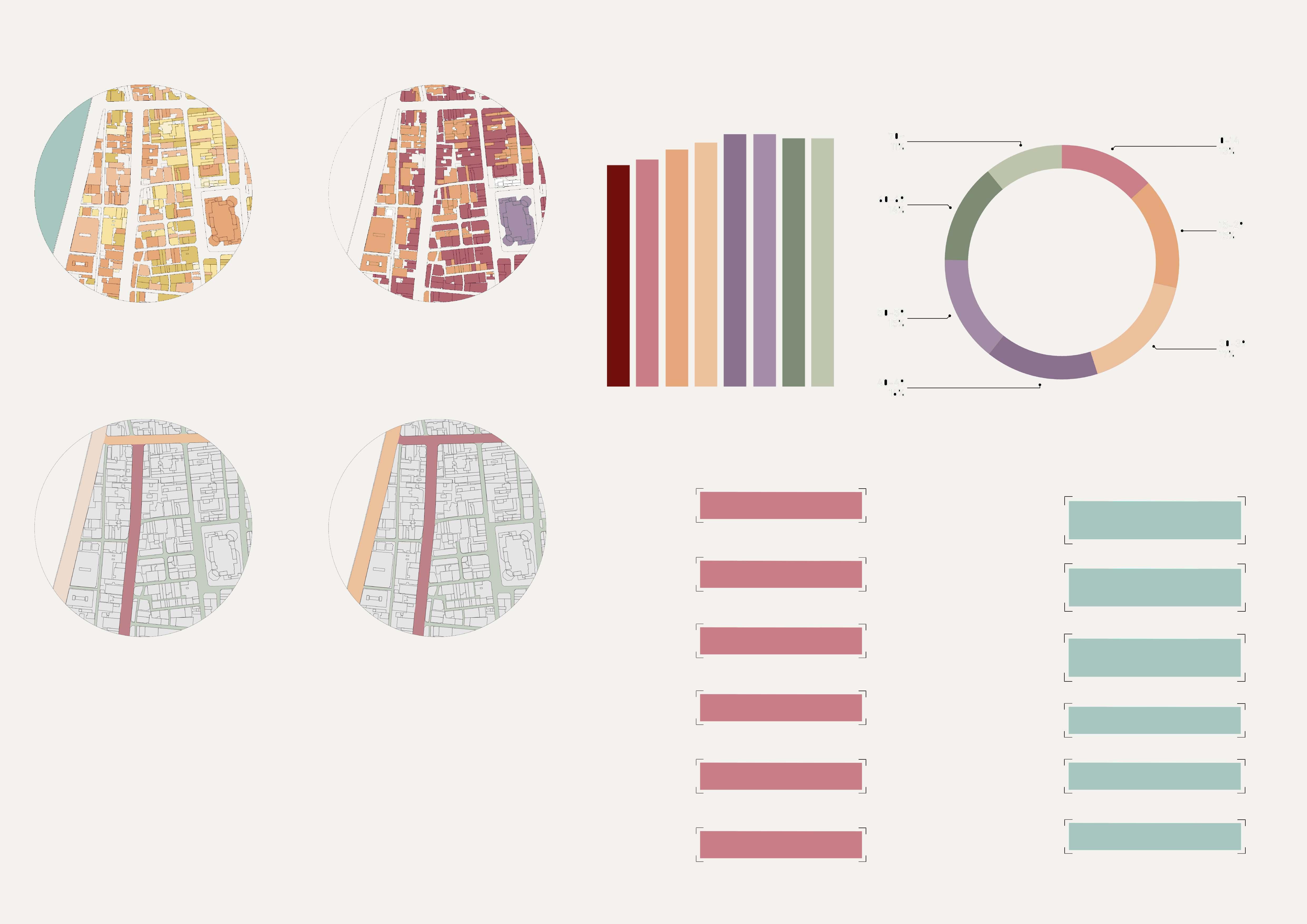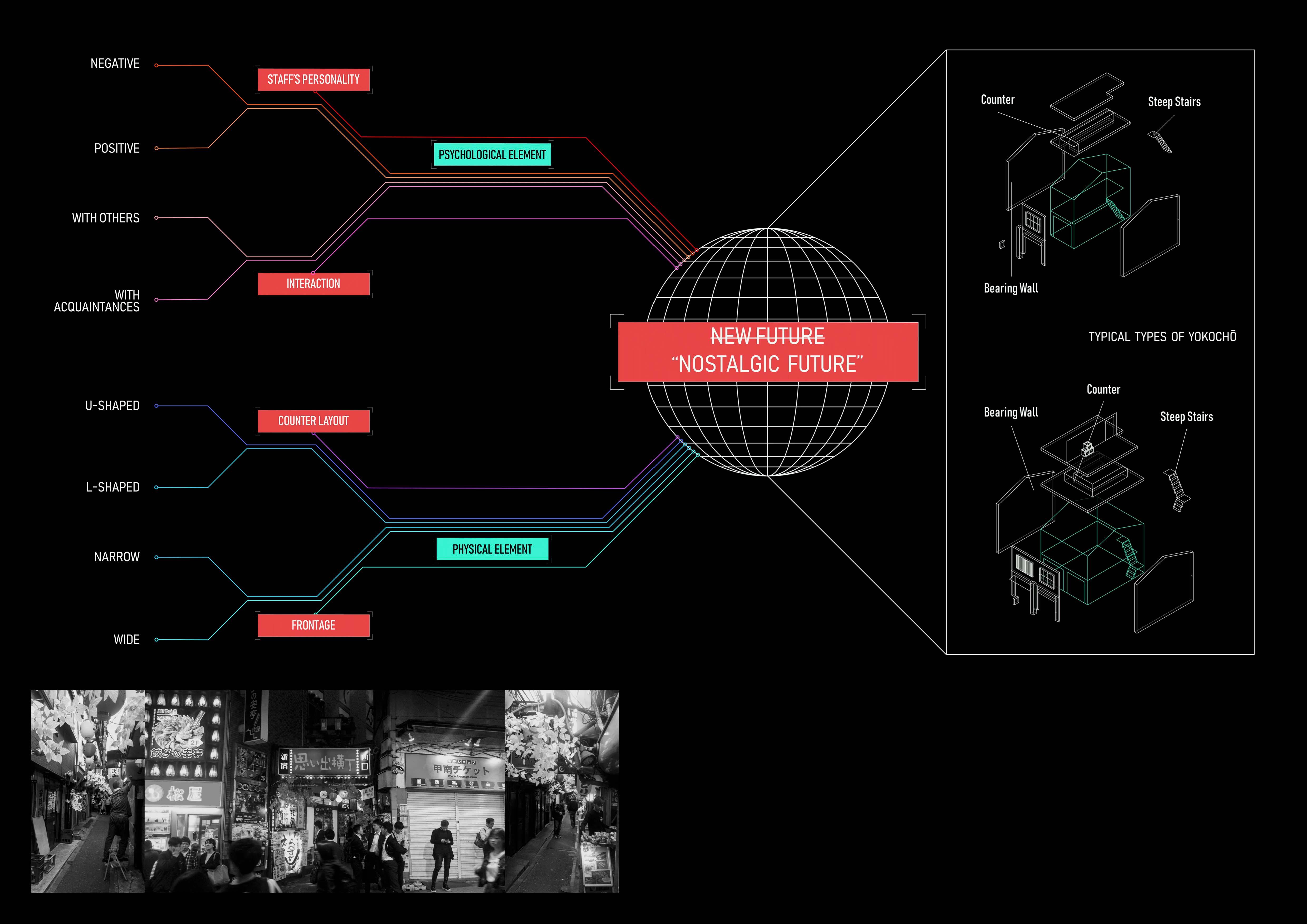 This diagram shows the analysis process on both physical and psychological levels, exploring the possibility of creating a nostalgicically-inspired future while maintaining a similar sense of scale. In the space mainly determined by the layout of counters and bearing walls, the frequency of interaction between people will gradually increase due to the slightly crowded physical environment. By breaking up and rearranging these spatial sequences, the user experience from the past can be adapted and integrated into a new environment.