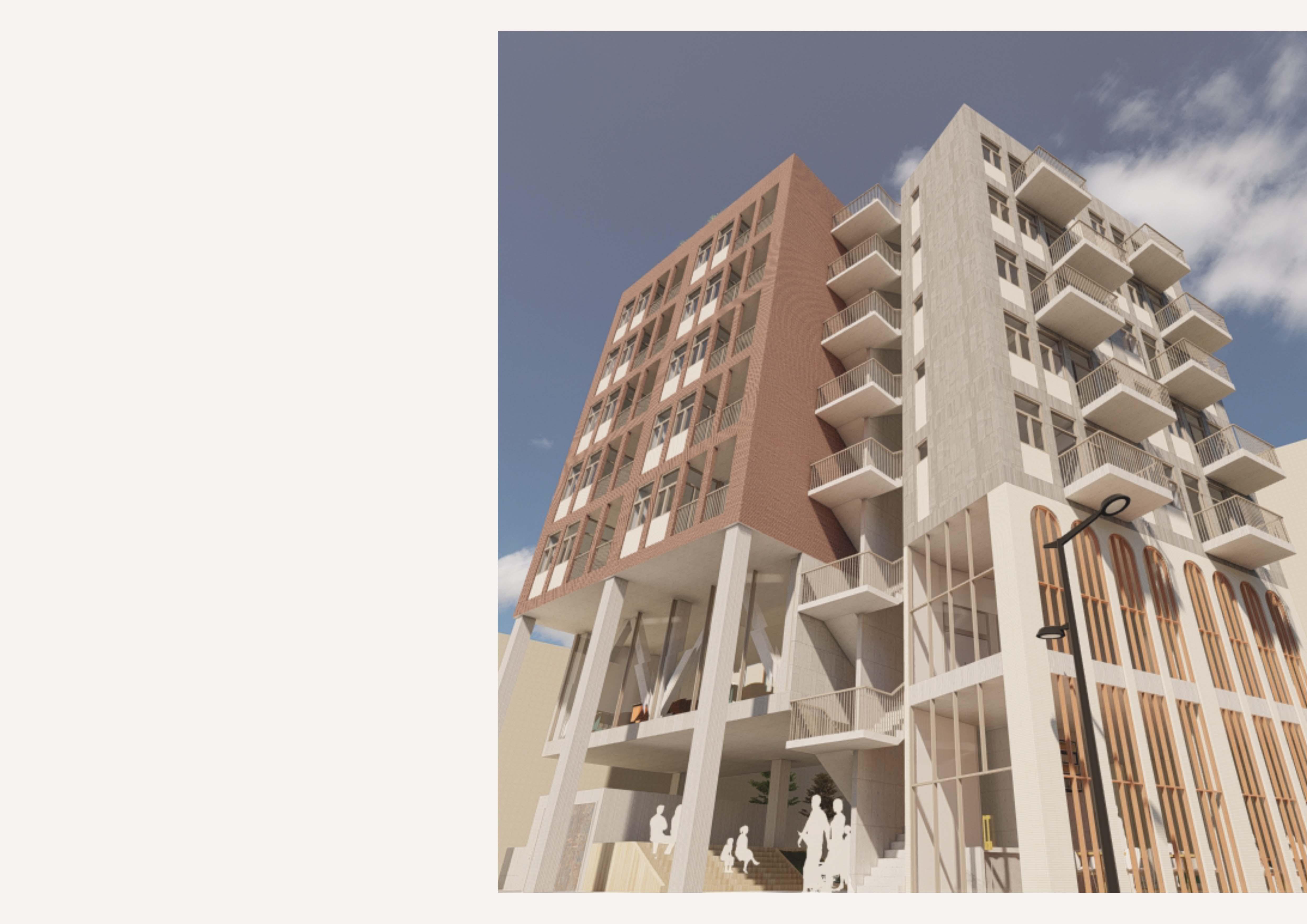 Placing balconies inside the building to reduce the visual impact on the alley. Adding balconies on the other side facing the main street provides more characteristics.