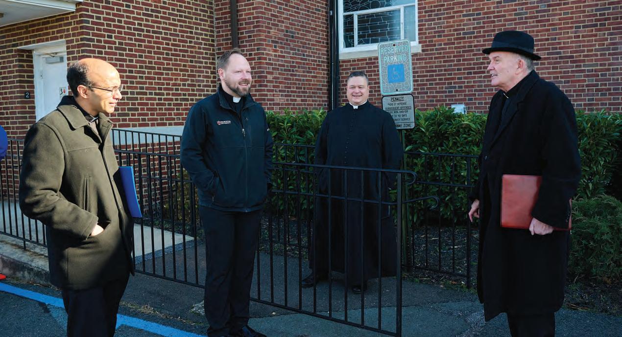 Bishop O’Connell arrives for the Advent Spirituality Day held Dec. 14 in St. John the Baptist Parish, Allentown. Greeting the Bishop are, from left, Father Joseph Thomas, keynote speaker; Father Zachary Swantek, and Father Michael Wallack. Mike Ehrmann photo
