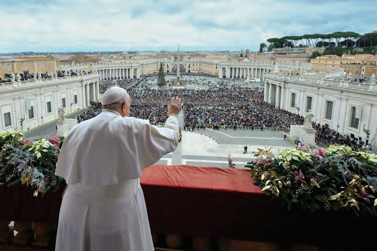 Pope Francis waves to an estimated 70,000 people gathered in St. Peter’s Square at the Vatican for his Christmas blessing “urbi et orbi” (to the city and the world) Dec. 25, 2023. CNS photo/Vatican Media