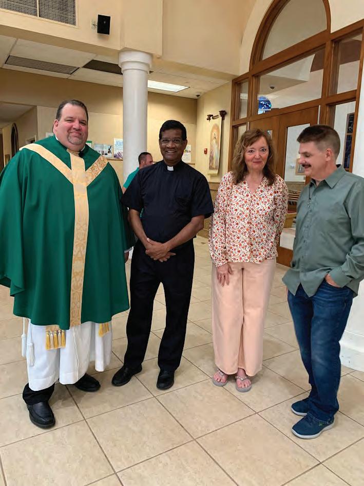 Divine Word Father Martin Padovani, standing to the right of the altar, was recognized for his more than five decades of service in the Diocese of Trenton on June 8. A Mass of Thanksgiving was celebrated in St. Mary Church, Bordentown, with Father Martin O’Reilly, pastor, serving as principal celebrant. After the Mass, a reception was held in the parish school. At left, he is shown with Deacon Larry and Jodie Finn. Father Padovani has moved to Techny, Ill., where he is now living in residence with members of his community. Facebook photos