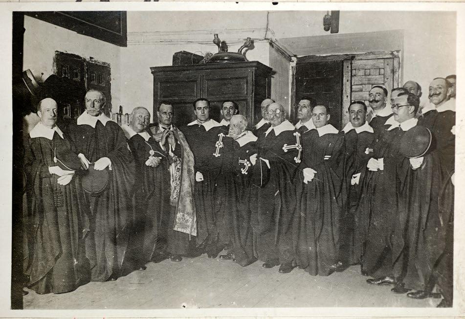 Un grupo de eclesiásticos (¿miembros del Cabildo?) posando sentados en una de las cátedras de las facultades de Medicina y Ciencias. Hilarión y Enrique Villuendas Torres. Colección de Carlos Marquina Arrieta.