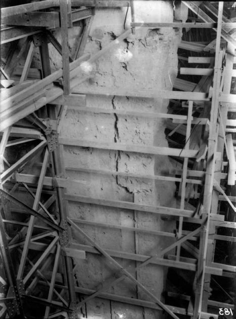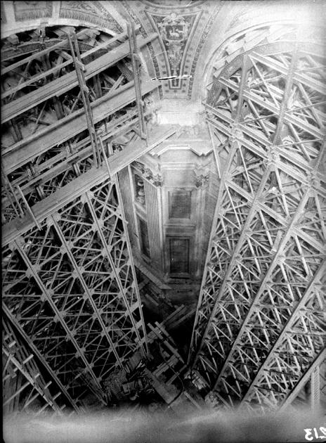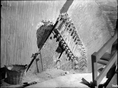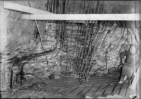 Del resto de los negativos del fondo dedicados al edificio Paraninfo, algunos son repetición casi literal, o con variaciones del punto de vista, el encuadre o el formato (vertical o apaisado), de los que fueron seleccionados para los álbumes, pero lo más novedoso es la existencia de vistas en las que se puede ver el proceso de construcción del edificio ya en una fase avanzada, con andamios y cimbras, operarios trabajando, restos de escombros y estancias con los suelos y las paredes de obra sin acabar. Hay algunas imágenes de sótanos y estancias de menor entidad, y otras que muestran elementos desaparecidos con el tiempo, como el departamento anatómico o un acceso con escaleras al edificio principal a través de la exedra trasera —en cuyo piso superior estaba la cátedra de conferencias públicas, ahora aula magna—. En una fotografía, la única de interior con personas, vemos a cuatro eclesiásticos5 posando sentados en los bancos de una de las cátedras. También quedaron fuera de la selección una