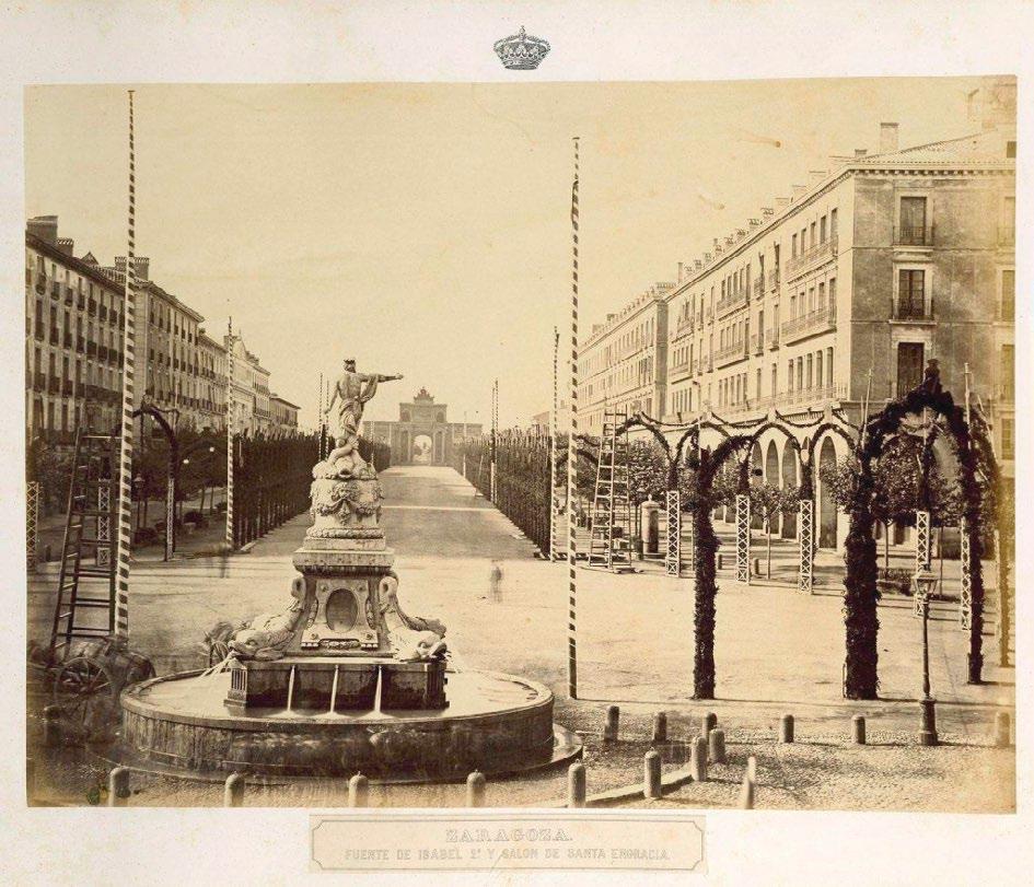 ante un comercio en cuyo cartel se anuncian «talleres de precisión», «instrumentos de matemáticas» e «instrumentos de topografía y geodesia».6 Finalmente hay una vista de atardecer y a pie de calle, con viandantes y carros, del camino de Torrero (luego y actualmente paseo de Sagasta).