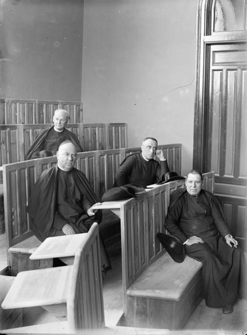 Un grupo de eclesiásticos (¿miembros del Cabildo?) posando sentados en una de las cátedras de las facultades de Medicina y Ciencias. Hilarión y Enrique Villuendas Torres. Colección de Carlos Marquina Arrieta