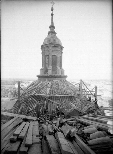 fotografía en la que se puede apreciar la ubicación del conjunto junto al cauce del Huerva, con el potente talud levantado a base de cajoneras de mampostería separadas por hiladas de ladrillo, y otra especialmente significativa y espectacular tomada desde el otro lado del puente de Santa Engracia con el edificio cubierto de andamios. Gran interés presentan las vistas captadas desde el torreón, con los tejados del inmueble y el lucernario del salón de actos en primer término, pues ofrecen una imagen hasta entonces inédita de la ciudad, y especialmente del entorno cercano del Paraninfo: la plaza de Aragón con sus hoteles y el edificio de Capitanía —que se terminó también en 1893—, el inconfundible teatro Pignatelli, la zona de los Campos Elíseos con una construcción circular descubierta con graderíos para espectáculos al aire libre, y las torres, los campos, los paseos arbolados, las fábricas, los talleres y los colegios que se situaban en los alrededores.