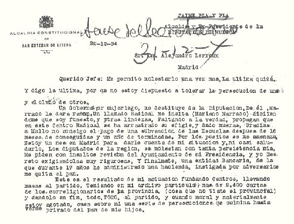 Un crío medio sofocado por la carrera gritaba: «¡Señor Plá, señor Plá, en casa del piquero, en la calle Estaño, hay un hombre muerto hace varios días que nadie entierra!». «¿Y qué quieres que haga yo?», le inquirí. «Mi padre me ha dicho: “Ve a ver a Plá, que él sabrá qué hacer”». Me quedé en San Esteban con dos de los trabajadores y al resto los envié hacia la finca para que comenzaran la jornada. Era octubre y los preparativos para la siembra estaban en pleno apogeo. […] guiados por el crío, llegamos a la casa, oscura y humilde como son la mayoría, y allí estaba el pobre hombre, tumbado en su cama. Era viudo y vivía solo, pues sus hijos habían emigrado como muchos otros en pos de una vida mejor. Con las idas y venidas ya había amanecido y al salir de nuevo a la calle pasó el secretario, el Tigre, hacia el ayuntamiento. Fui tras él y le pregunté por los aspectos legales para poder enterrarlo. «Ve a ver primero al cura», me espetó. Y envié al crío a por el sacerdote.