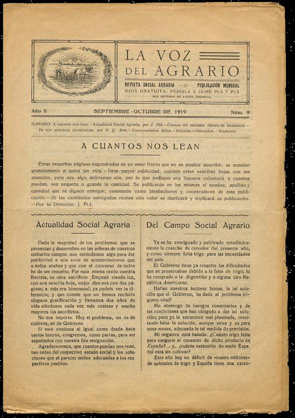 Plá sabía de antemano que la propiedad de la tierra del pueblo al que había llegado estaba mal repartida. Eso no era una excepción en la comarca, pues existían en ella grandes propietarios que tenían las mayores y mejores tierras, y el resto de las fincas eran de pequeña extensión. El cereal de secano, el olivar y el viñedo predominaban en el término, y, aunque una parte de él se podía poner en regadío, los procedimientos para nivelar el terreno y ejecutar las obras necesarias para acercar en la práctica el agua a los campos progresaban con lentitud. Además, hechos como la compra de las tierras desamortizadas a mediados del siglo xix había, si no agravado, sí alejado la oportunidad de corregir en alguna medida ese gran desequilibrio, del que el ejemplo más sangrante fue la adquisición de la llamada torre de los Frailes, propiedad del clero, cuyas rentas eran destinadas al socorro de