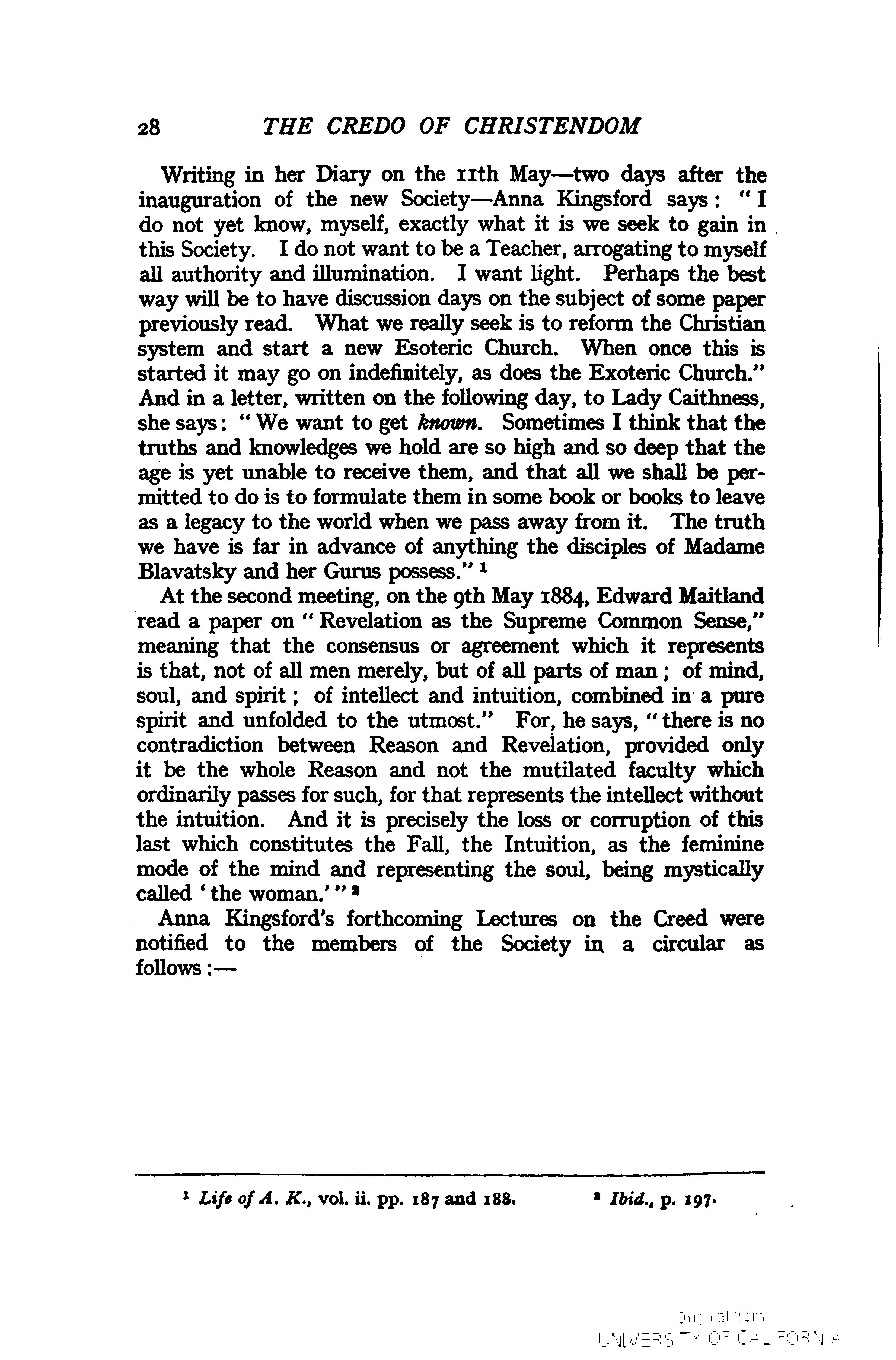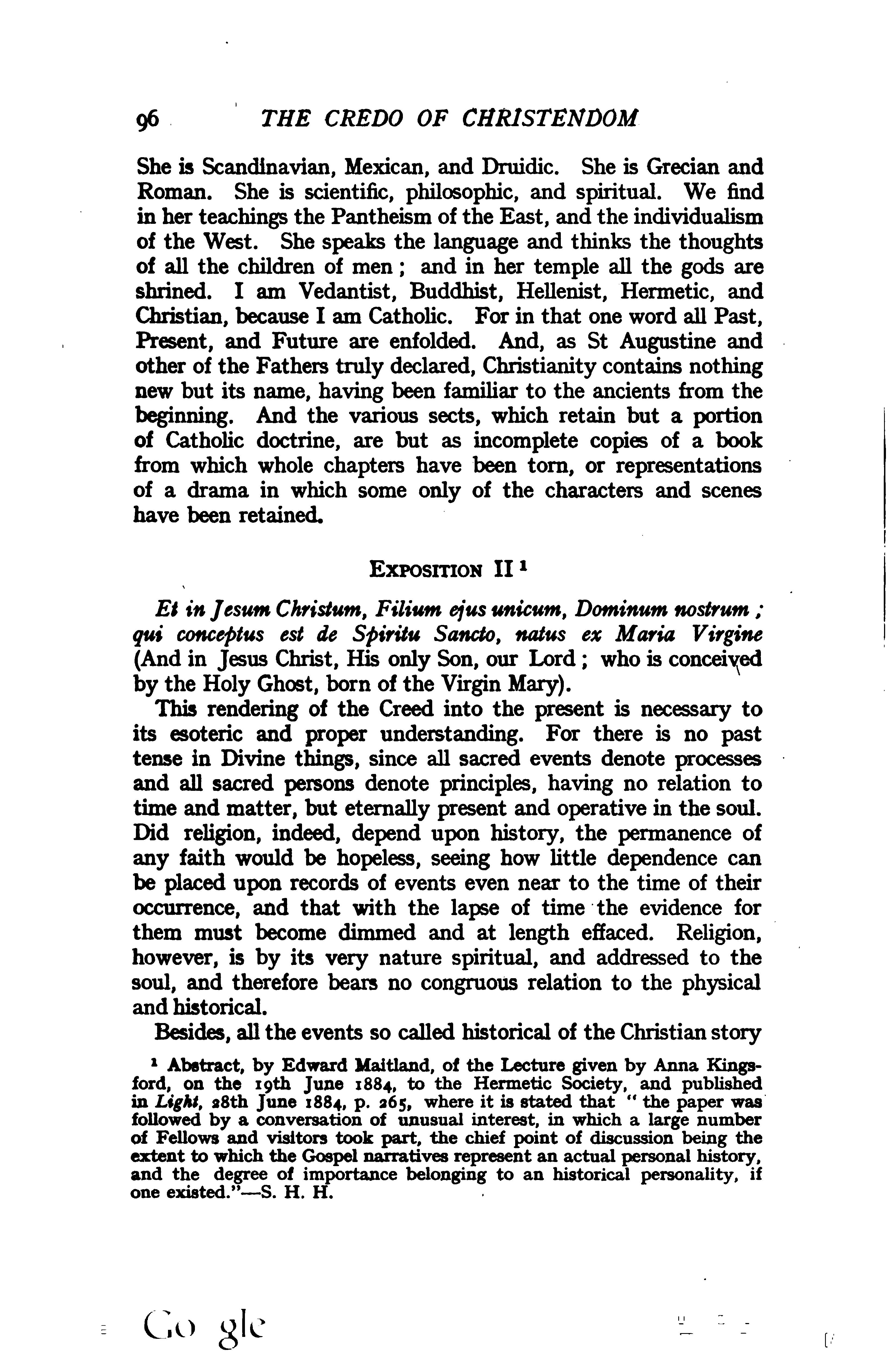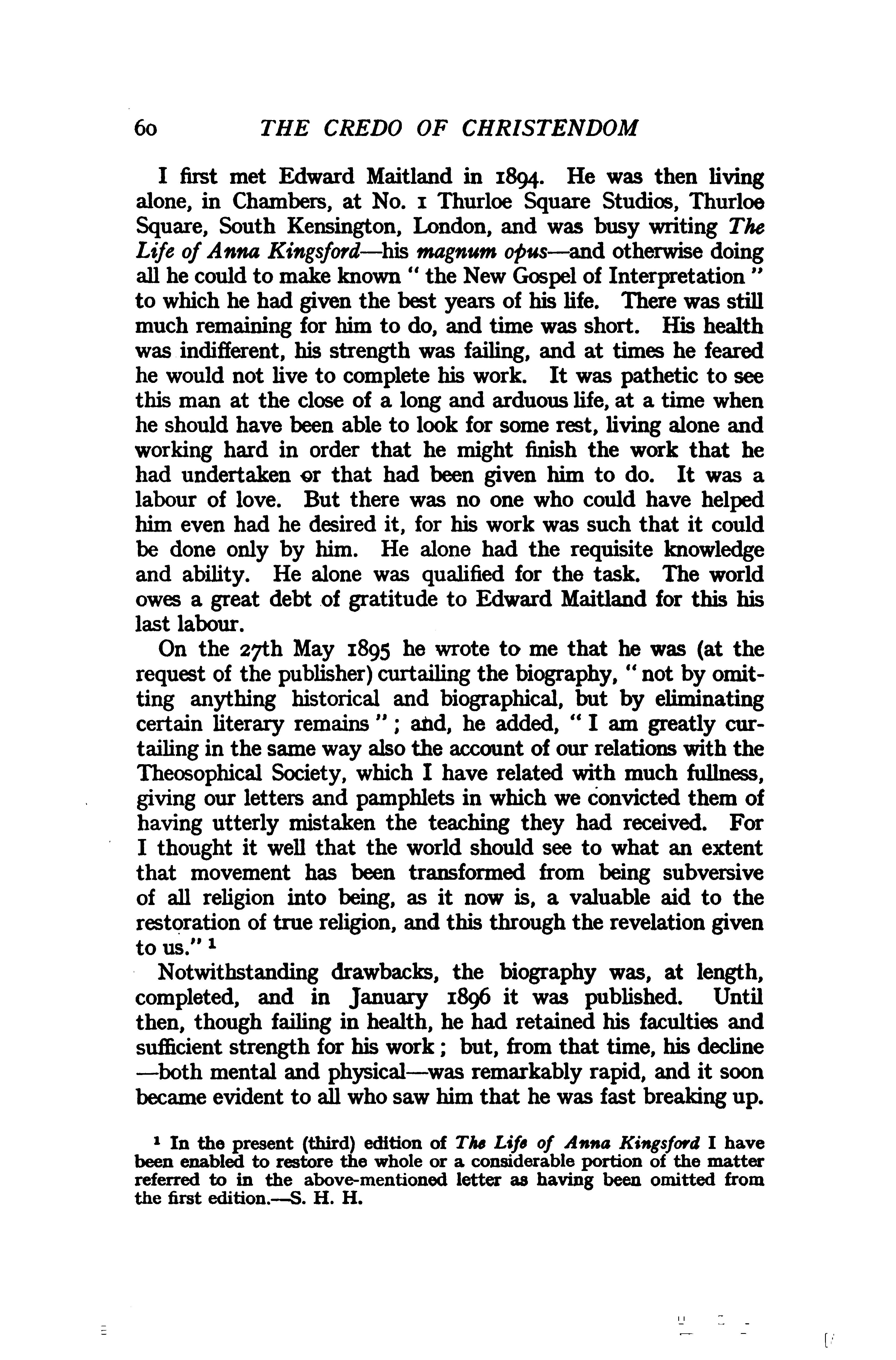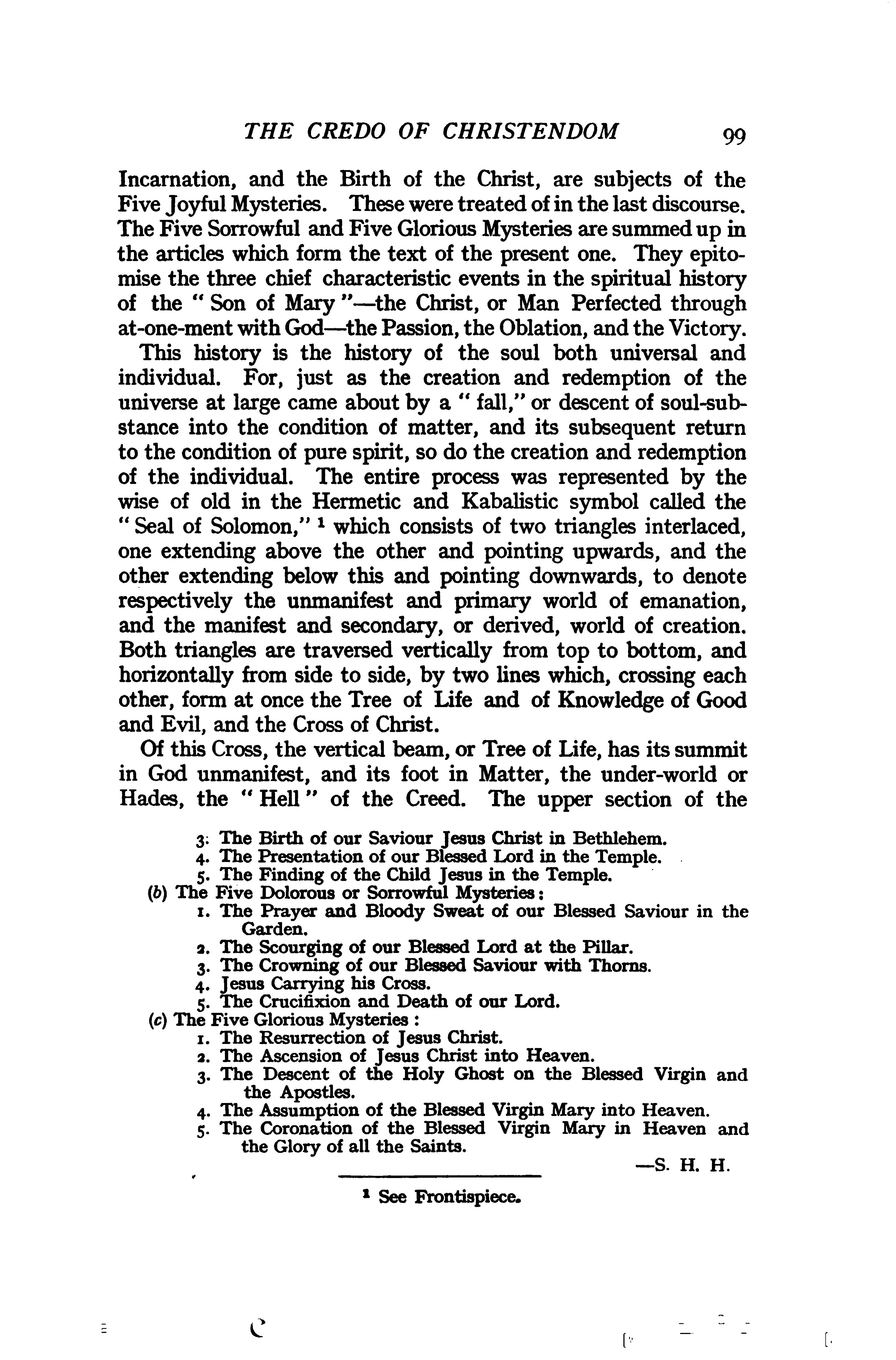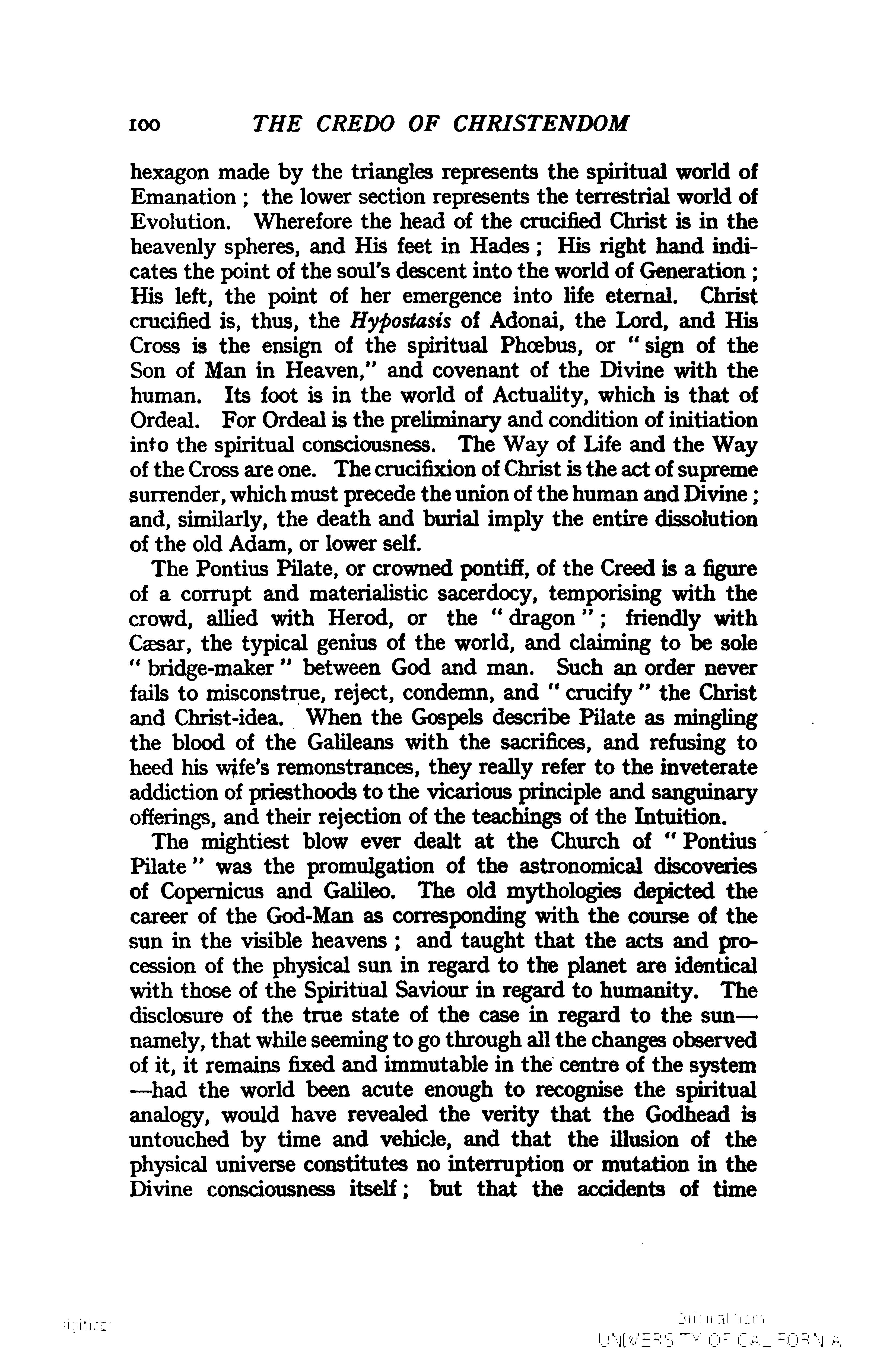 Full title: The Credo of Christendom and other Addresses and Essays on Esoteric Christianity. Contents: Biographical Preface; LECTURES: The Credo of Christendom; The Hermetic Fragment Koré Kosmou, the Virgin of the World; The Method of the Mystics; Karma; Bible Hermeneutics; “Violationism,” or Sorcery in Science; The Systematisation and Application of Psychic Truth; ESSAYS and LETTERS: The Constitution of Man; Concerning Re-Incarnation; The Doctrine of “Shells; Extraneous Spirits and Obsession; The Historic “Jesus”; Fate, Heredity, and Re-Incarnation; The Mystic Kings of the East; Christian Mysticism; Animals and their Souls; The Trinity. Index. Source : The International Association for the Preservation of Spiritualist and Occult Periodicals (IAPSOP): http://iapsop.com/ssoc/ . License CC BY-NC-SA 3.0: https://creativecommons.org/licenses/by-nc-sa/3.0/deed.en ..