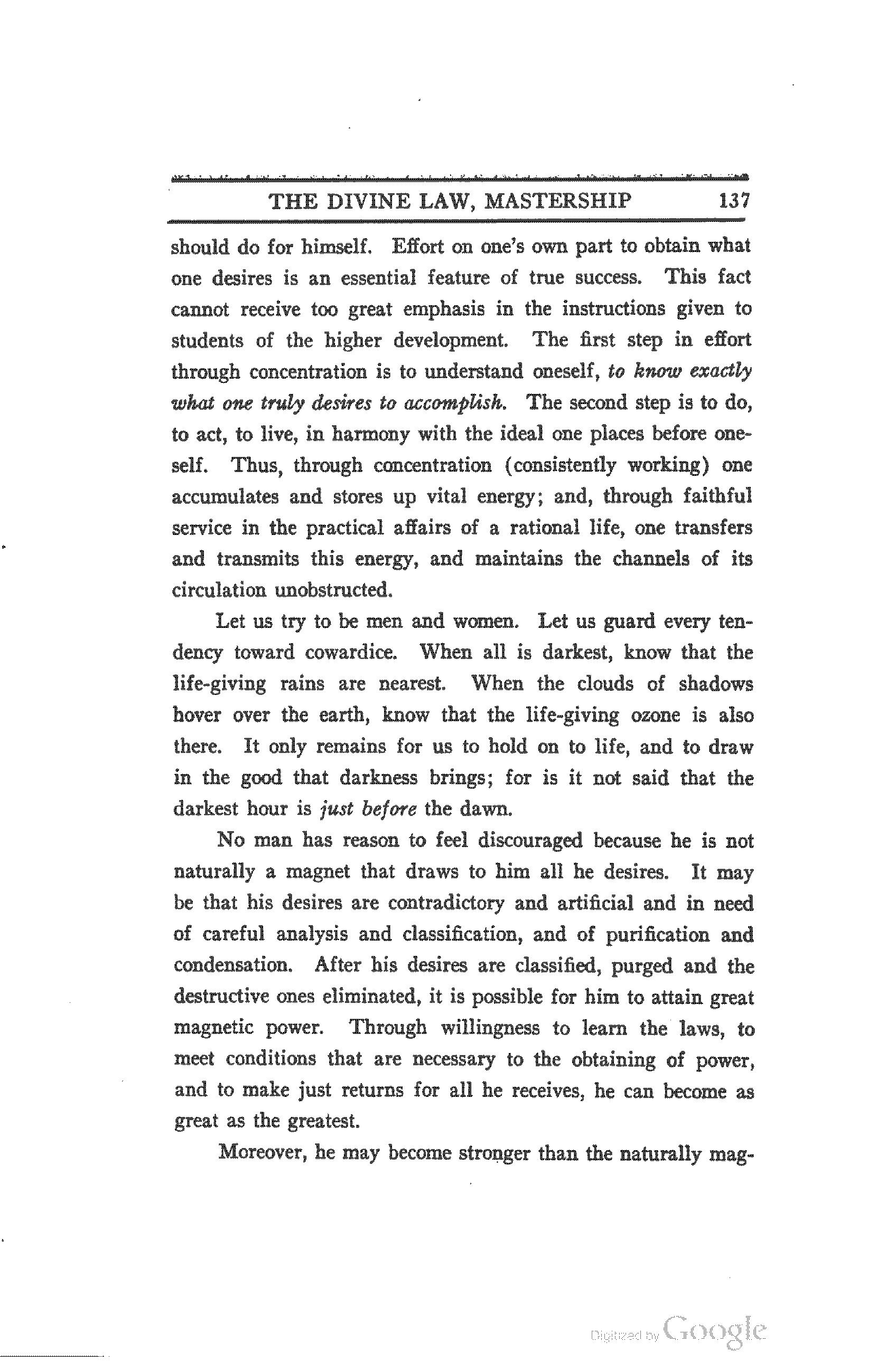 Third: It requires the concentration and centralization of all potentialities in the entire being, so that there shall be at command the necessary strength and fortitude to work continuously and in harmony with the desire.