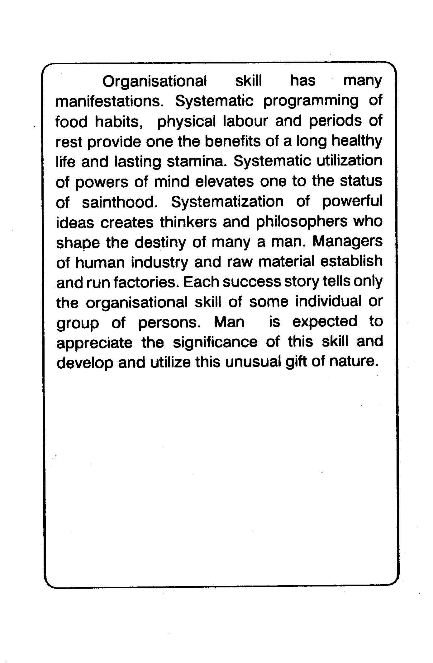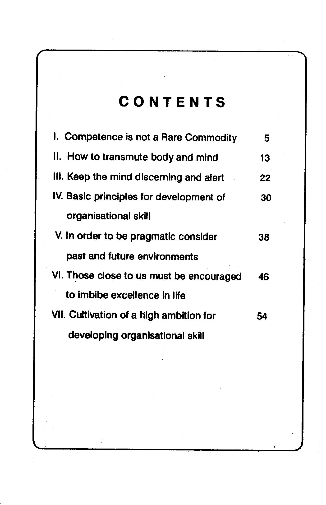 Dignity of Organisational Skill. Contents: Preface; I.Competence is not a Rare Commodity; II. How to transmute body and mind; III. Keep the mind discerning and alert; IV. Basic principles for development of organisational skill; V. In order to be pragmatic consider past and future environments; VI. Those close to us must be encouraged to imbibe excellence in life; VII. Cultivation of a high ambition for developing organisational skill.
