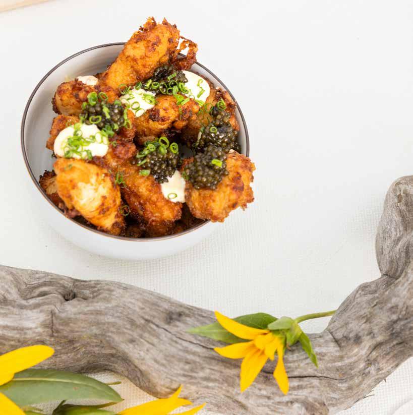 SEARED BAY SCALLOPS: MEYER LEMON CAULIFLOWER SAUCE, ONION AND CAPER SOFRITO, HERB OIL