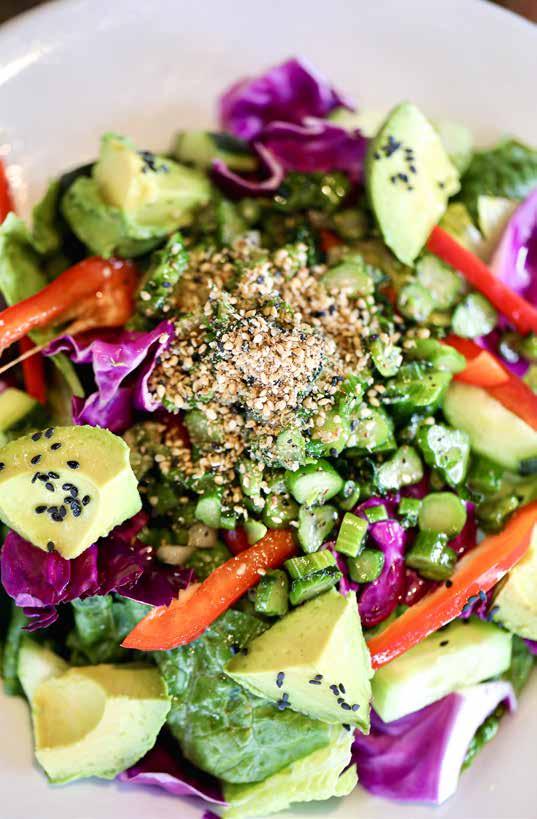 BBQ RANCH SALAD: ROMAINE AND ICEBERG, AVOCADO, TOMATO, CUCUMBERS, BLACK BEANS, ONION STRINGS, BBQ RANCH DRESSING