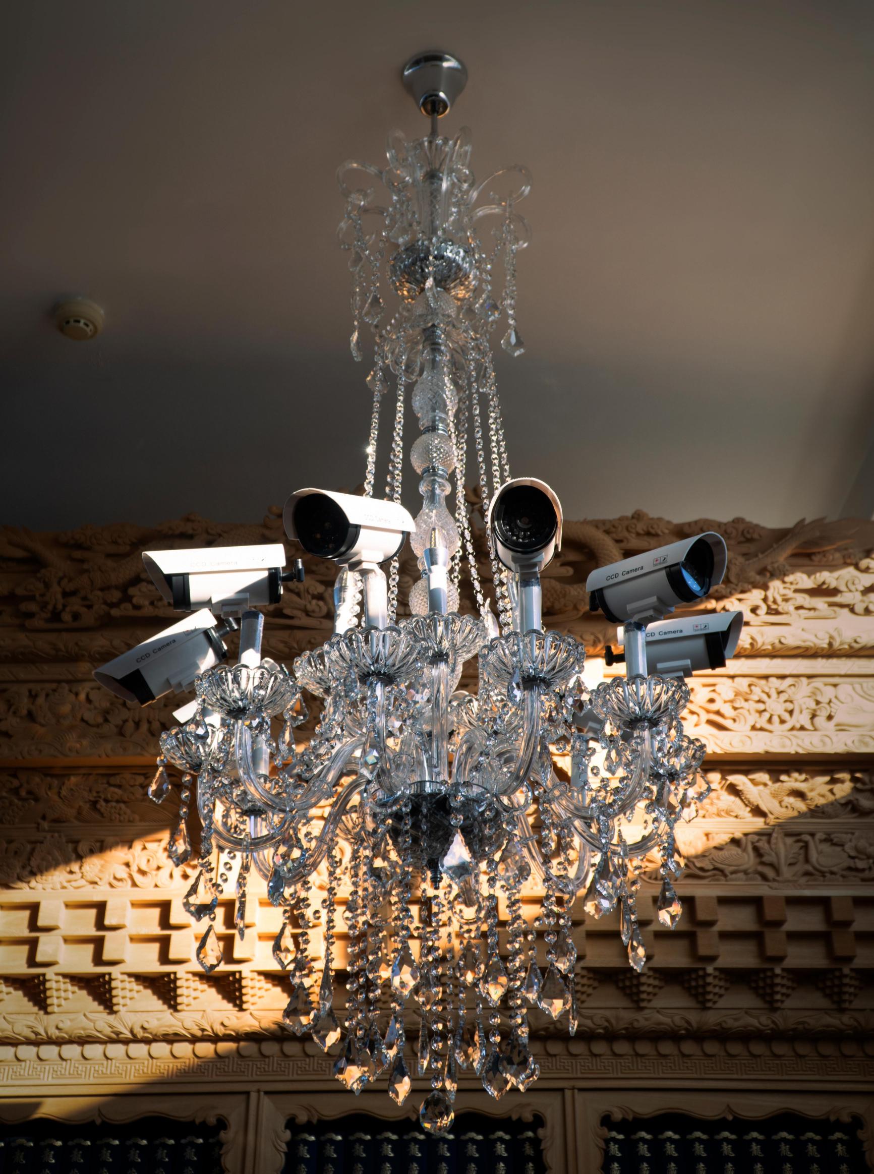 Thisinstalla�onintegratesasurveillance camerawithinacrystalchandelier, visuallydisrup�ngtheharmonyand tranquilityofthehomeenvironmentand conceptuallychallengingthewidespread acceptanceofsurveillanceandprivacyin contemporarysociety.Thework ques�onsthephenomenonof surveillancelurkingwithinseemingly privatedomes�cspaces,sugges�ngthat eveninourmostpersonalsanctuaries, wemaynotescapethefateofbeing monitored.